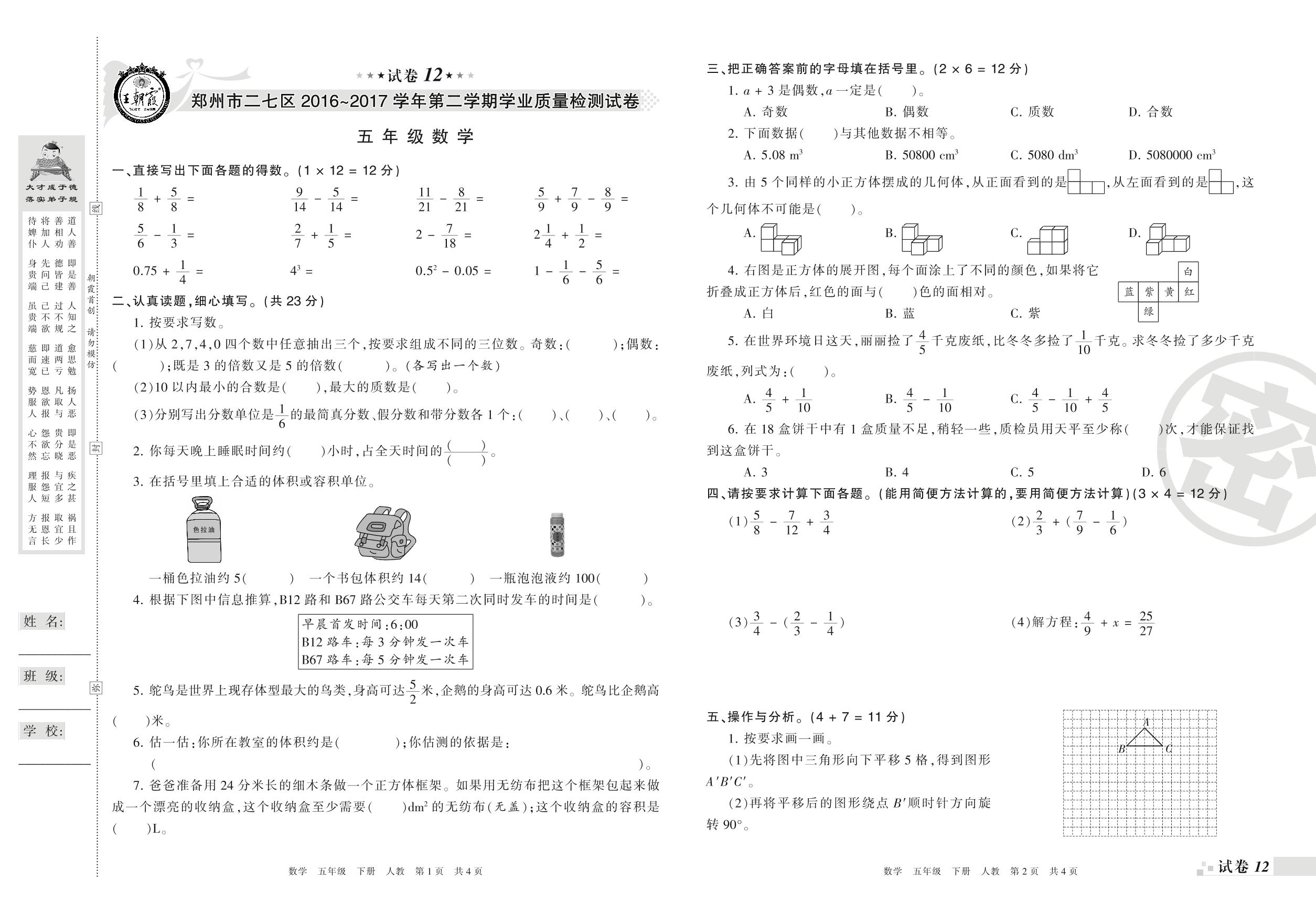 2016-2017学年第二学期郑州市二七区五年级数学试卷(人教版)【12】