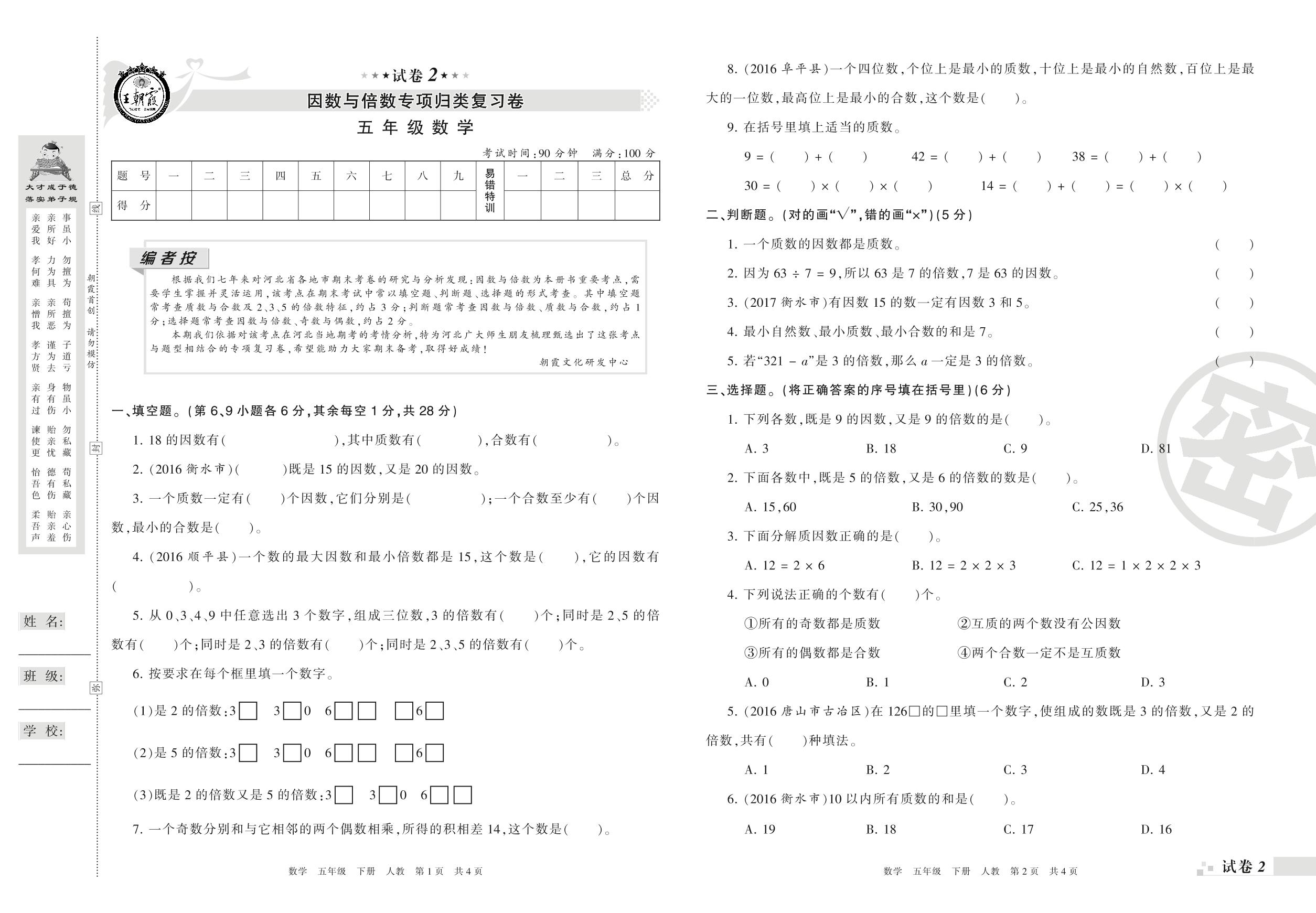 王朝霞期末专项卷——因数与倍数专项归类复习卷五年级下册数学(人教版)_R220125155721415【2】