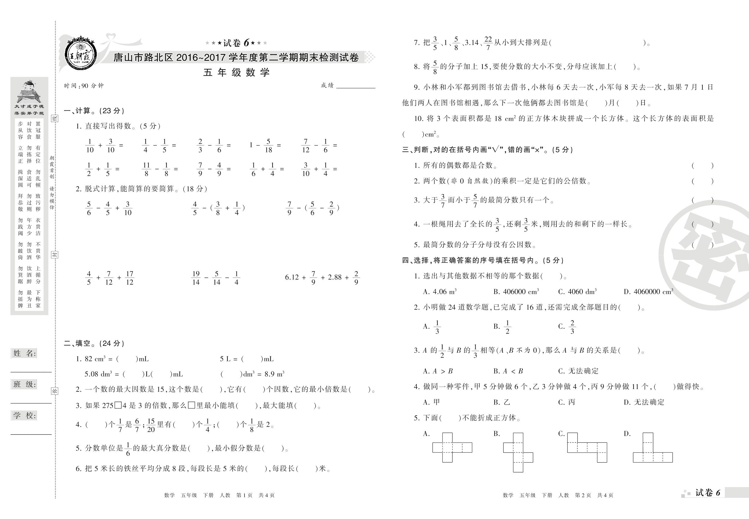 2016-2017学年第二学期唐山市路北区五年级数学试卷(人教版)【6】