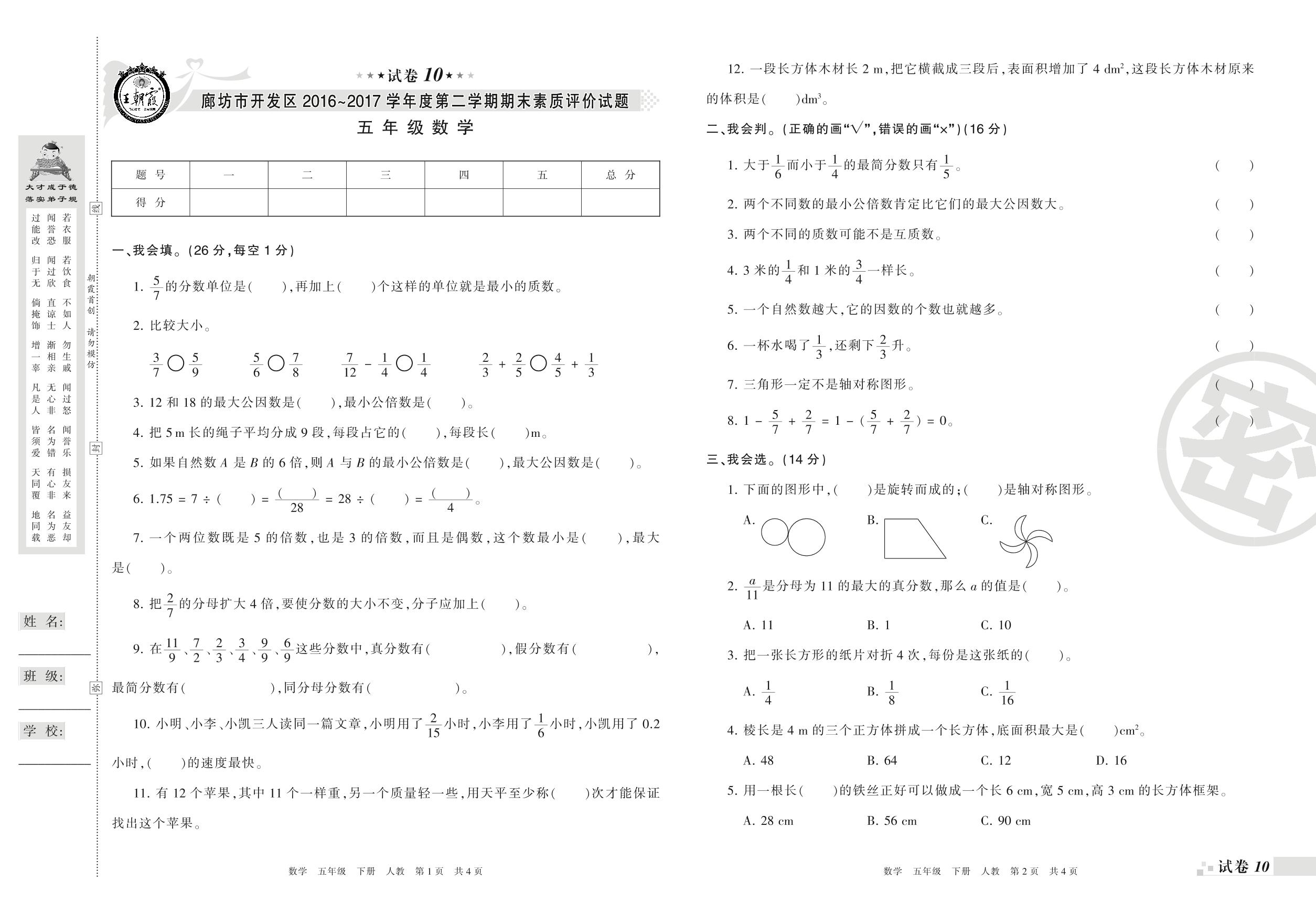 2016-2017学年第二学期廊坊市开发区五年级数学试卷(人教版)【10】