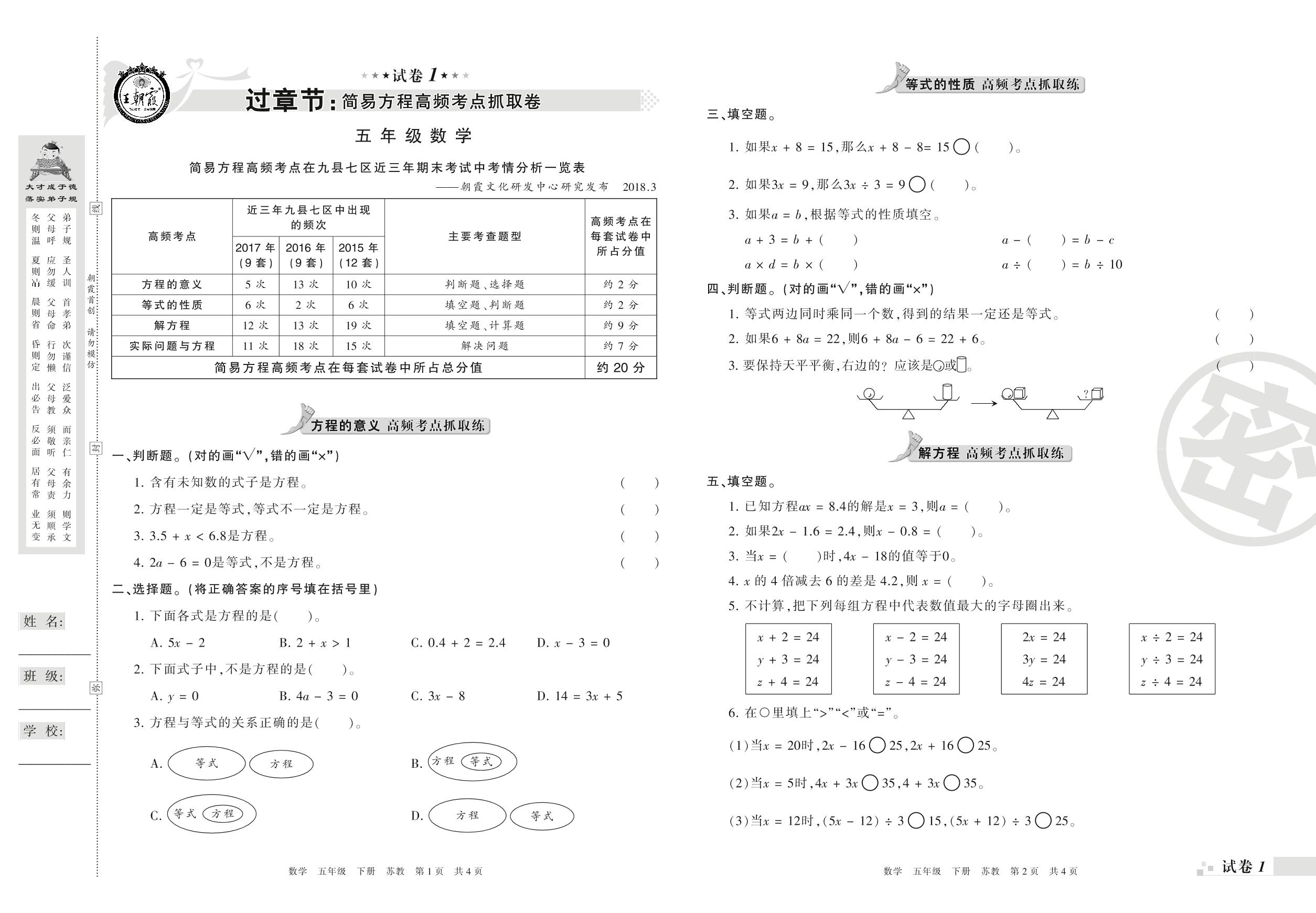 王朝霞期末过章节:简易方程高频考点抓取卷五年级下册数学(苏教版)【1】