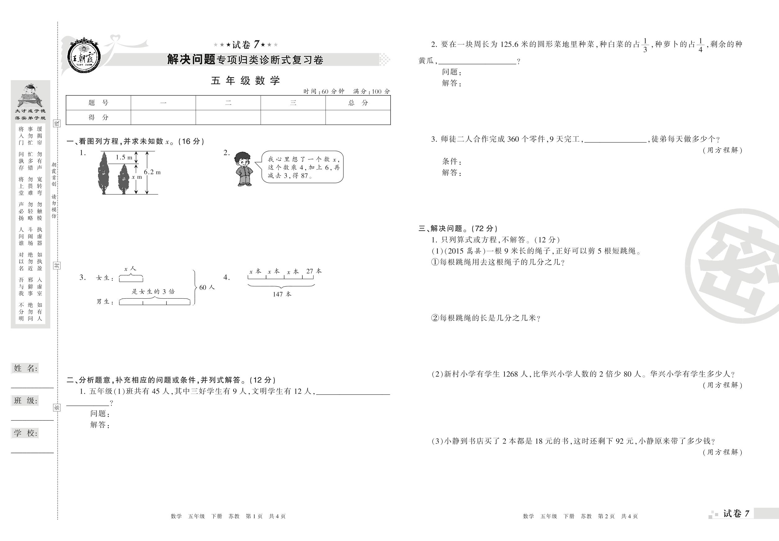 王朝霞期末专项卷——解决问题专项归类诊断式复习卷五年级下册数学(苏教版)【7】