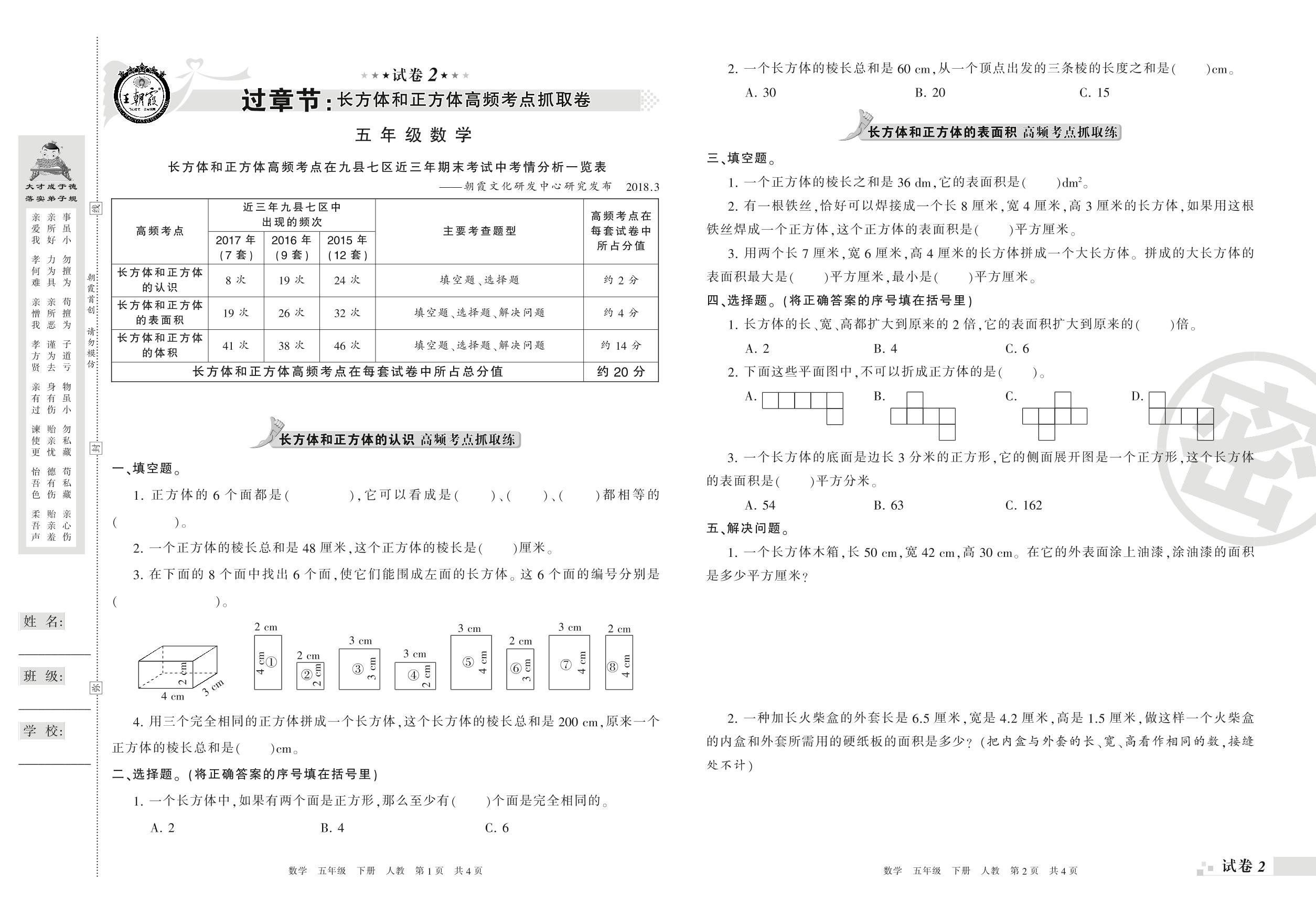 王朝霞期末过章节:长方体和正方体高频考点抓取卷五年级下册数学(人教版)_R220125160618588【2】