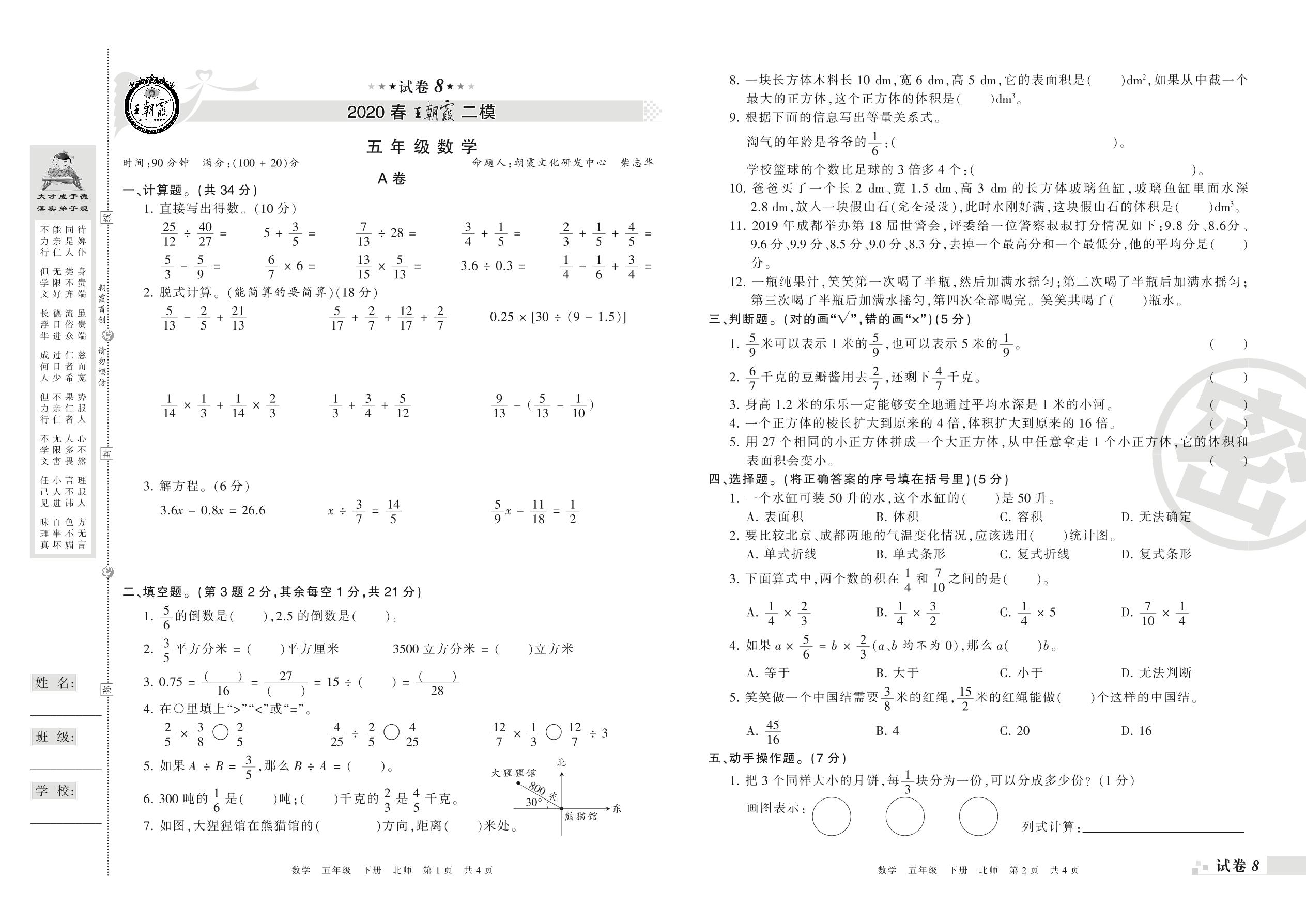 王朝霞期末模拟卷五年级下册数学(北师版)_R21080584512【8】