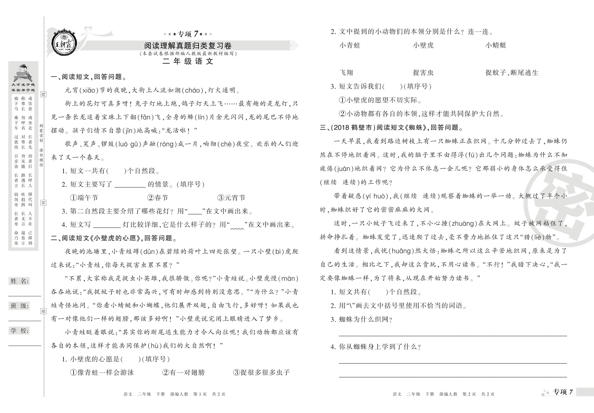 王朝霞期末专项卷——阅读理解、写话真题归类复习二年级下册语文(人教版)_R21080171914【0】