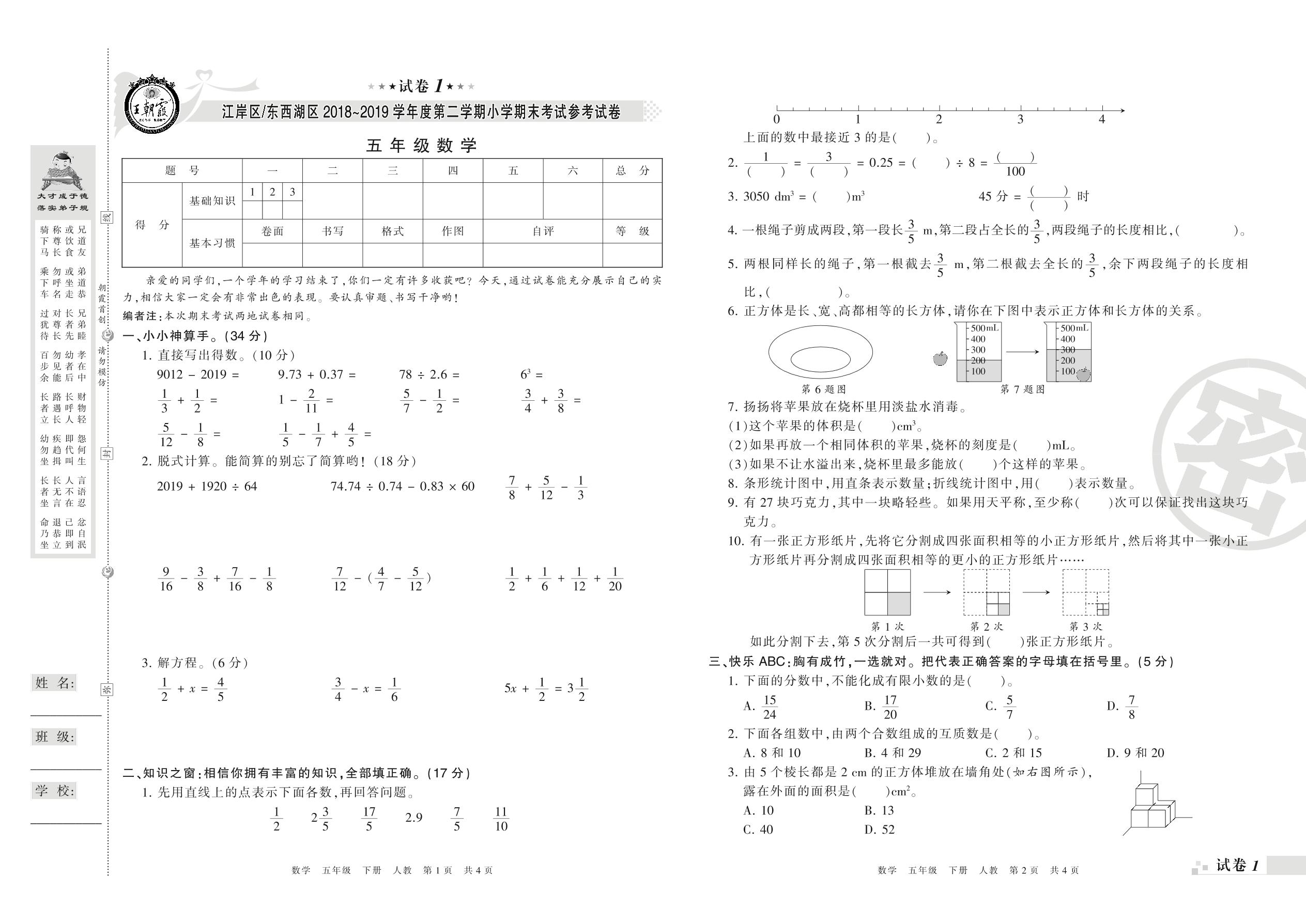 2018-2019学年第二学期武汉市江岸区、东西湖区五年级数学试卷(人教版)【1】