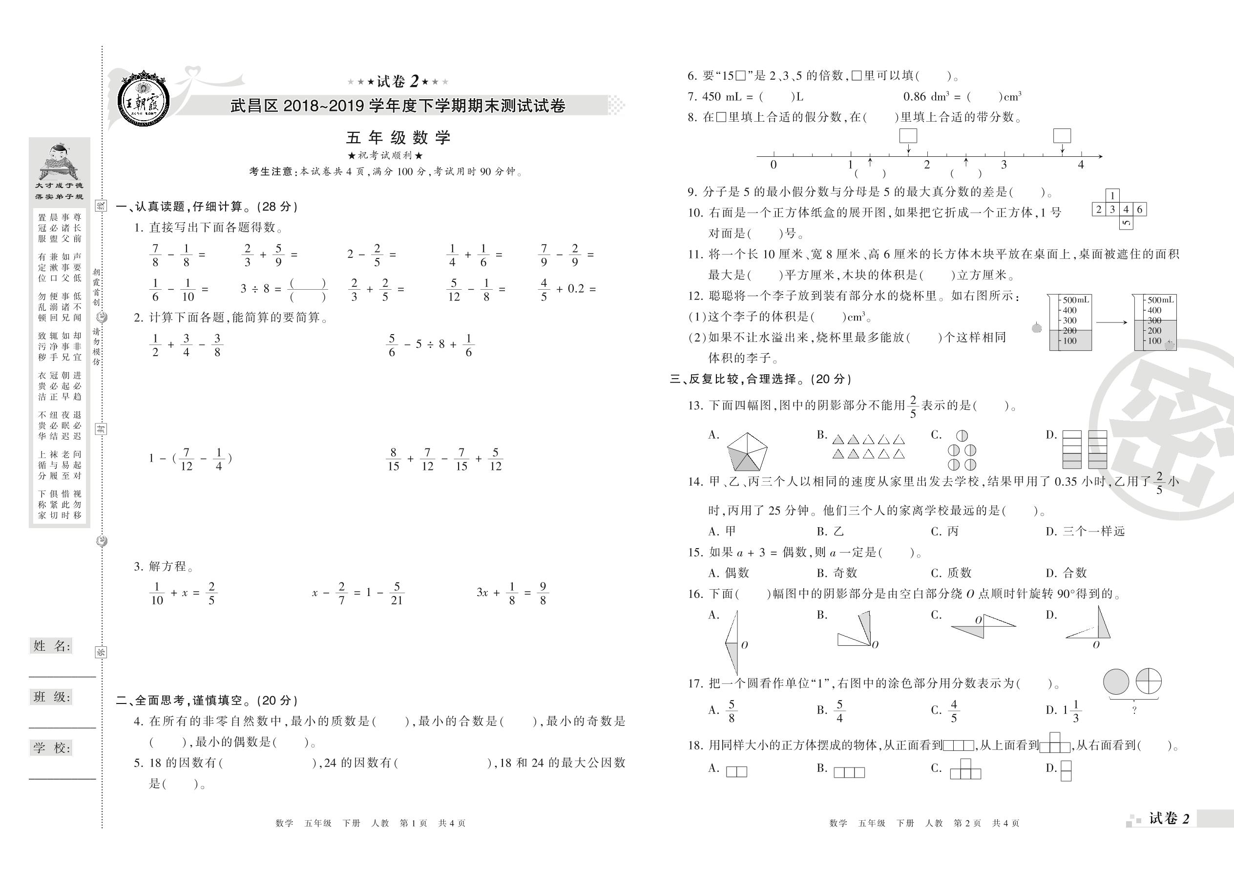 2018-2019学年第二学期武汉市武昌区五年级数学试卷(人教版)【2】