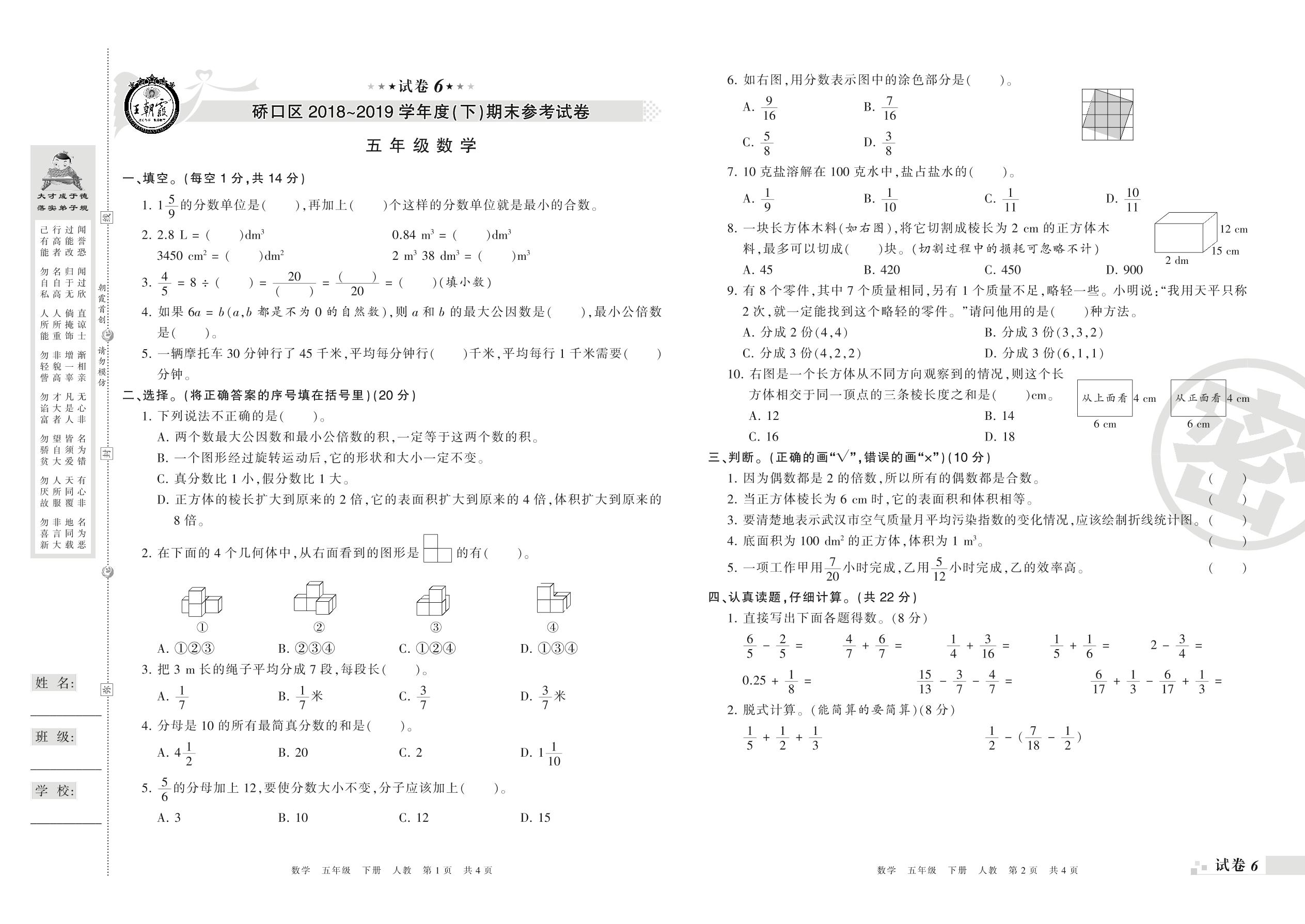 2018-2019学年第二学期武汉市硚口区五年级数学试卷(人教版)【6】
