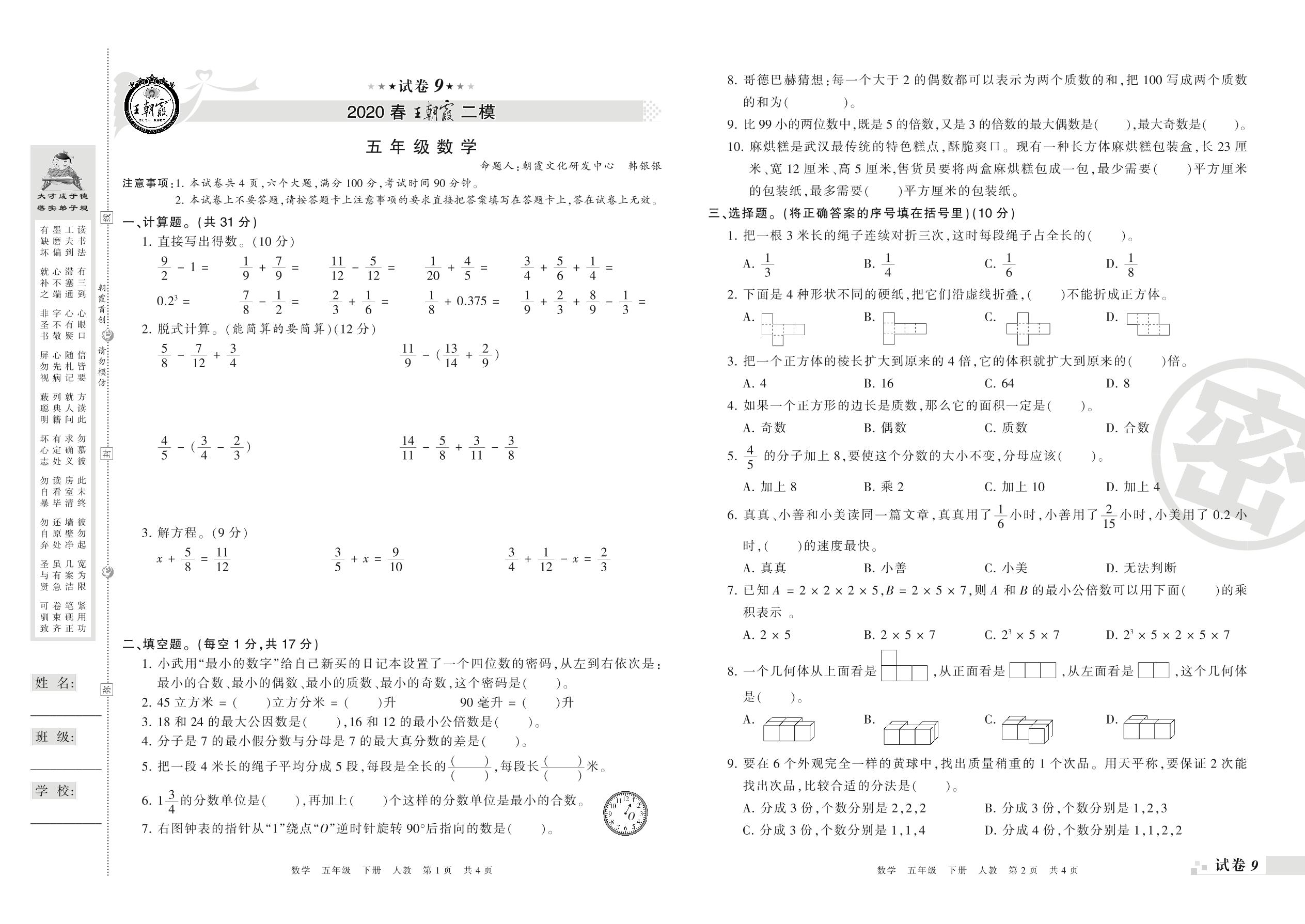 王朝霞期末模拟卷五年级下册数学(人教版)_R21080584635【9】