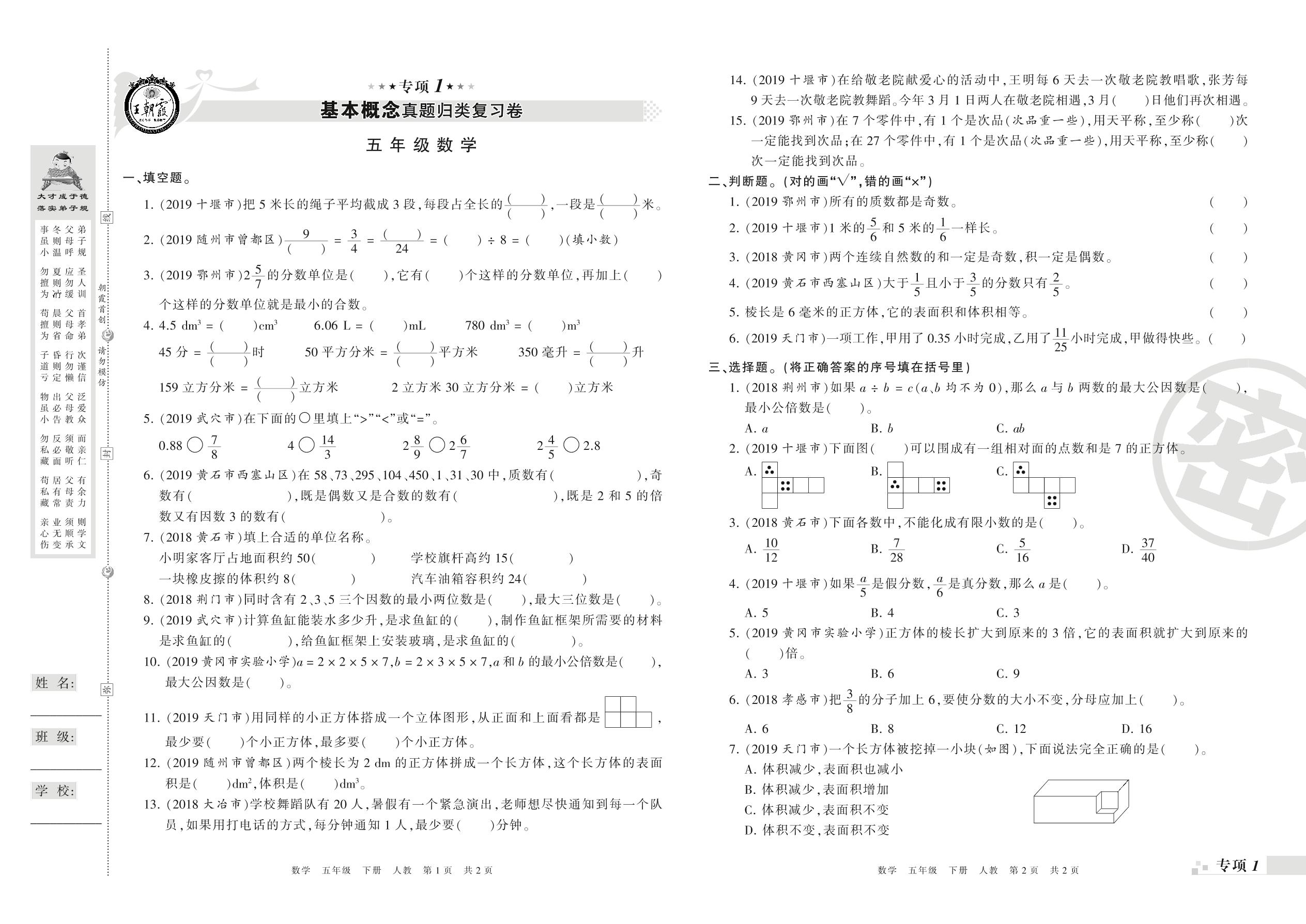 王朝霞期末专项卷——基本概念、计算真题归类复习卷五年级下册数学(人教版)_R21080584646【0】