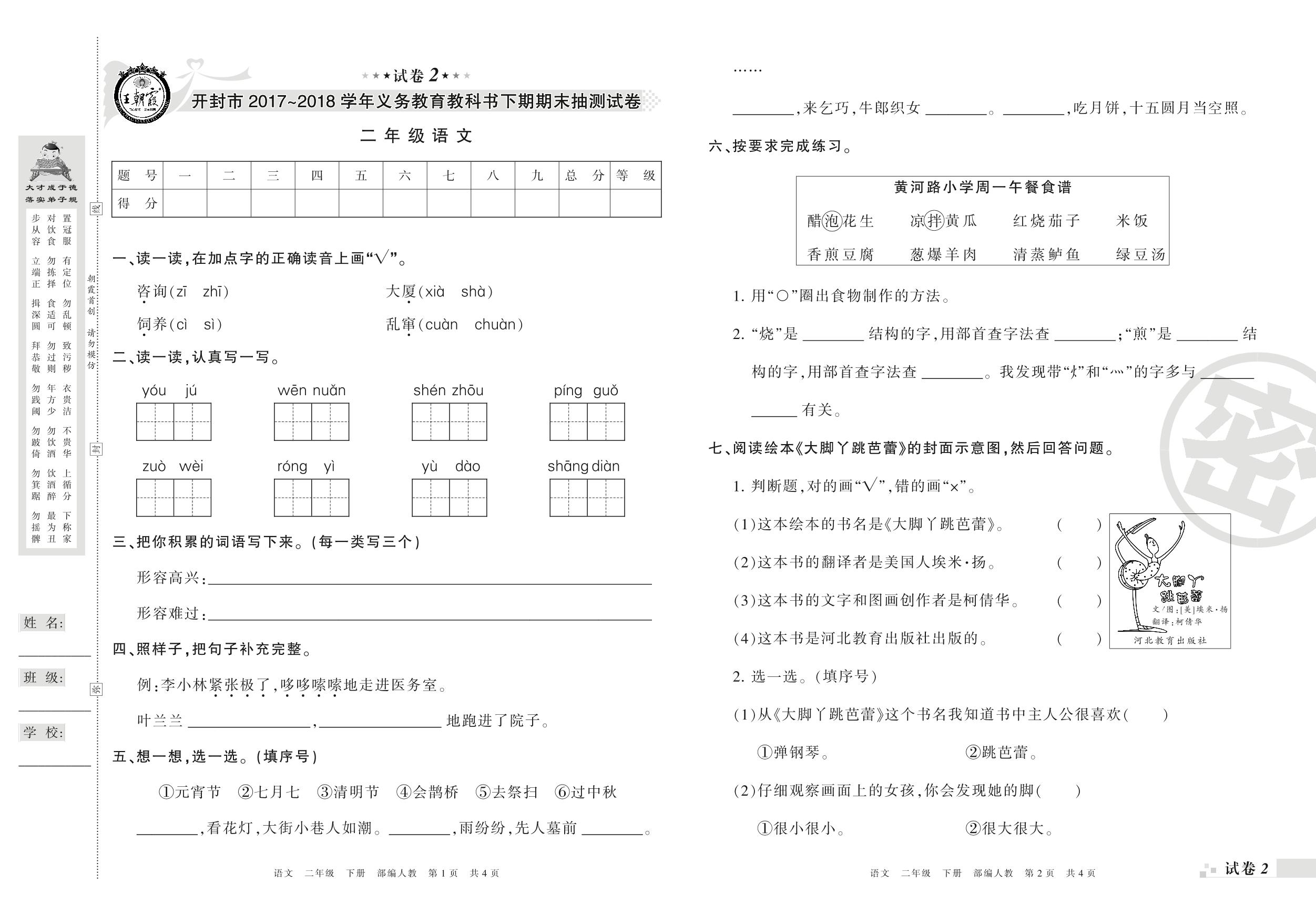 2017-2018学年第二学期开封市二年级语文试卷(人教版)【2】