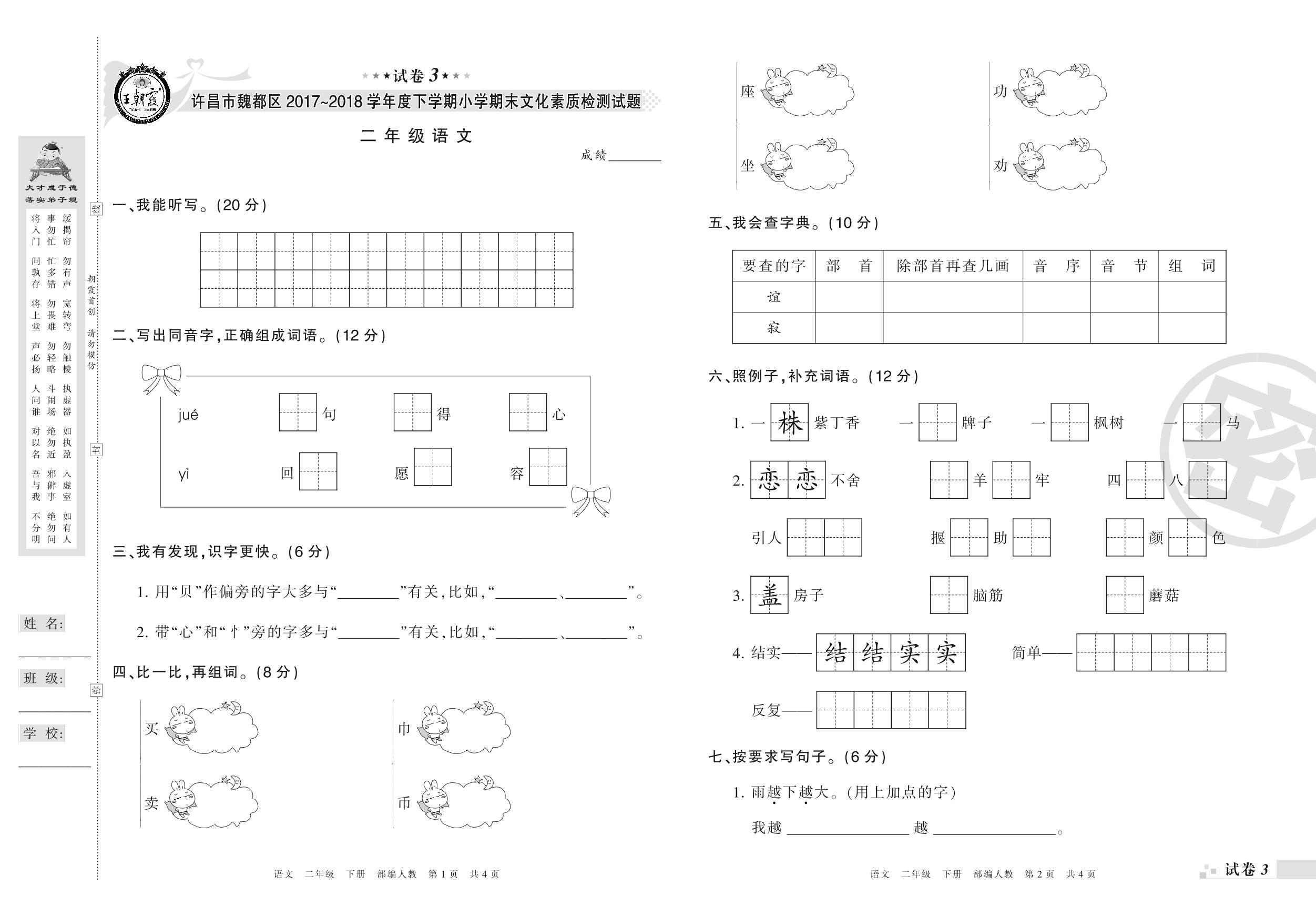 2017-2018学年第二学期许昌市魏都区二年级语文试卷(人教版)【3】