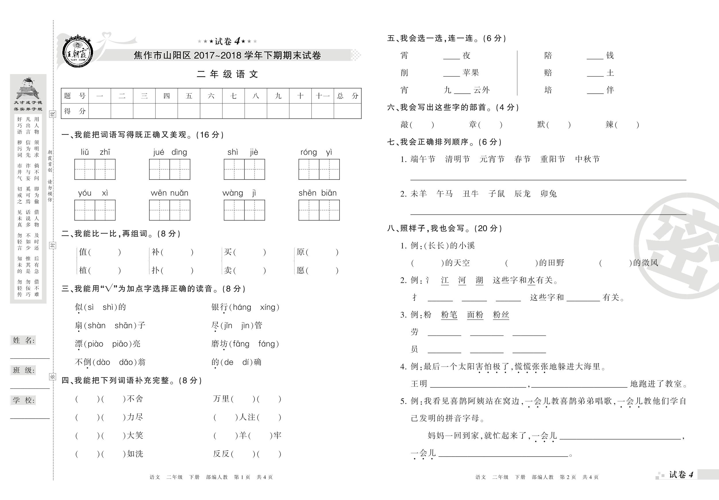 2017-2018学年第二学期焦作市山阳区二年级语文试卷(人教版)【4】