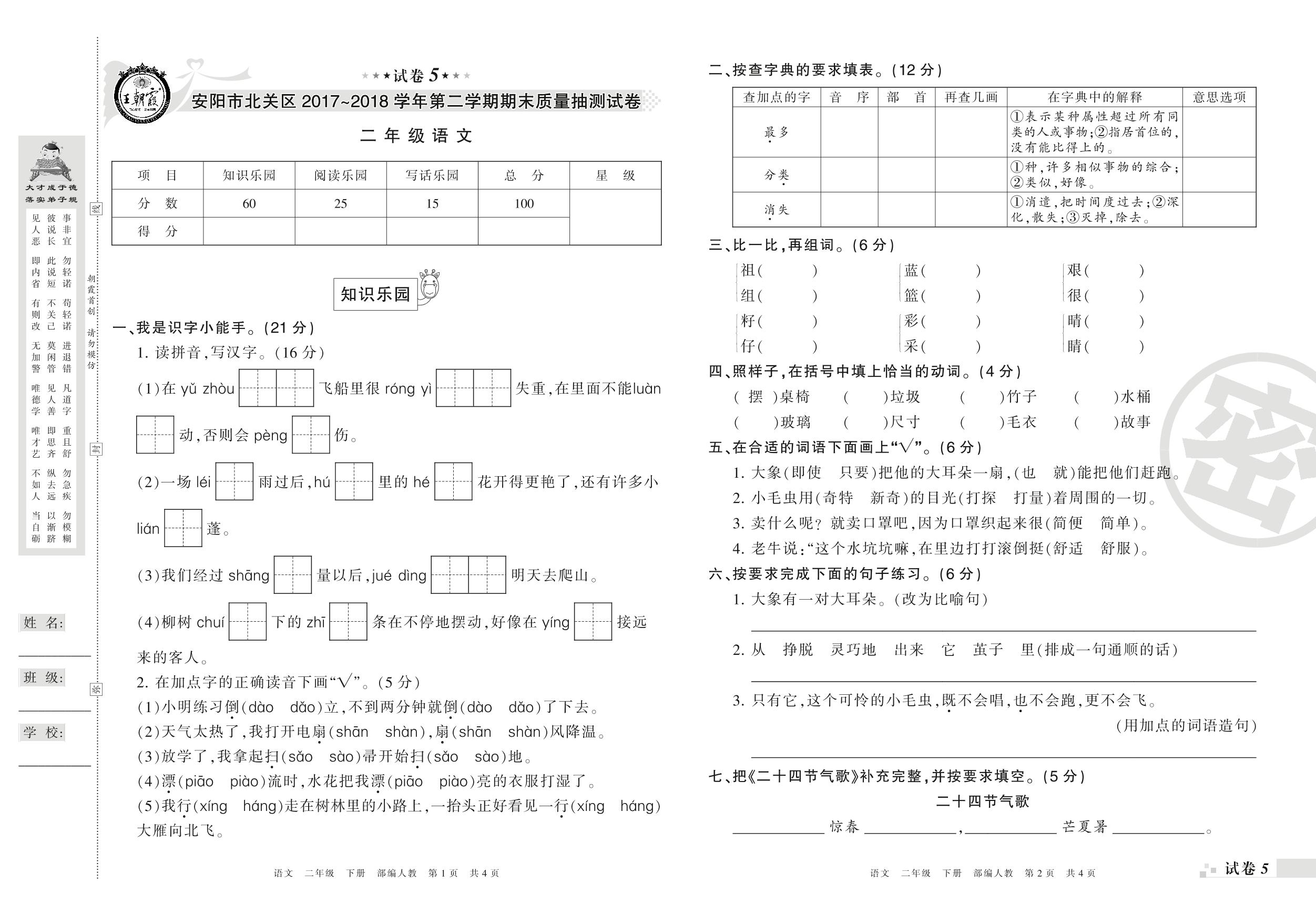2017-2018学年第二学期安阳市北关区二年级语文试卷(人教版)【5】