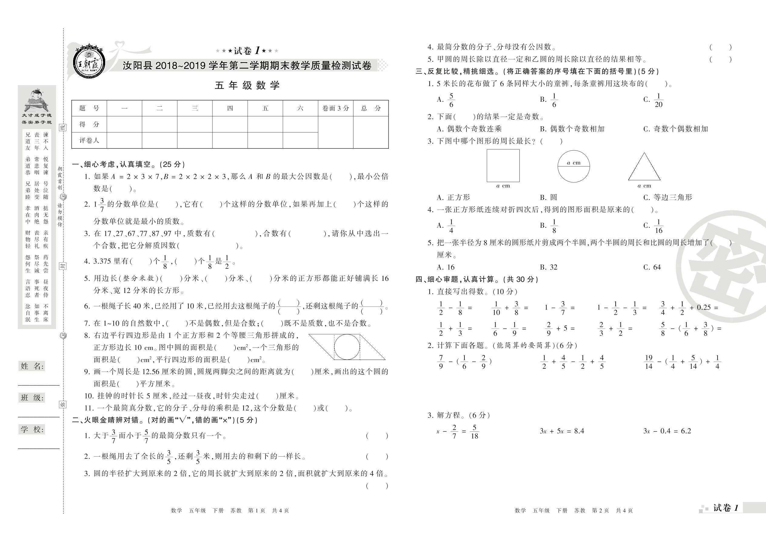 2018-2019学年第二学期洛阳市汝阳县五年级数学试卷(苏教版)【1】