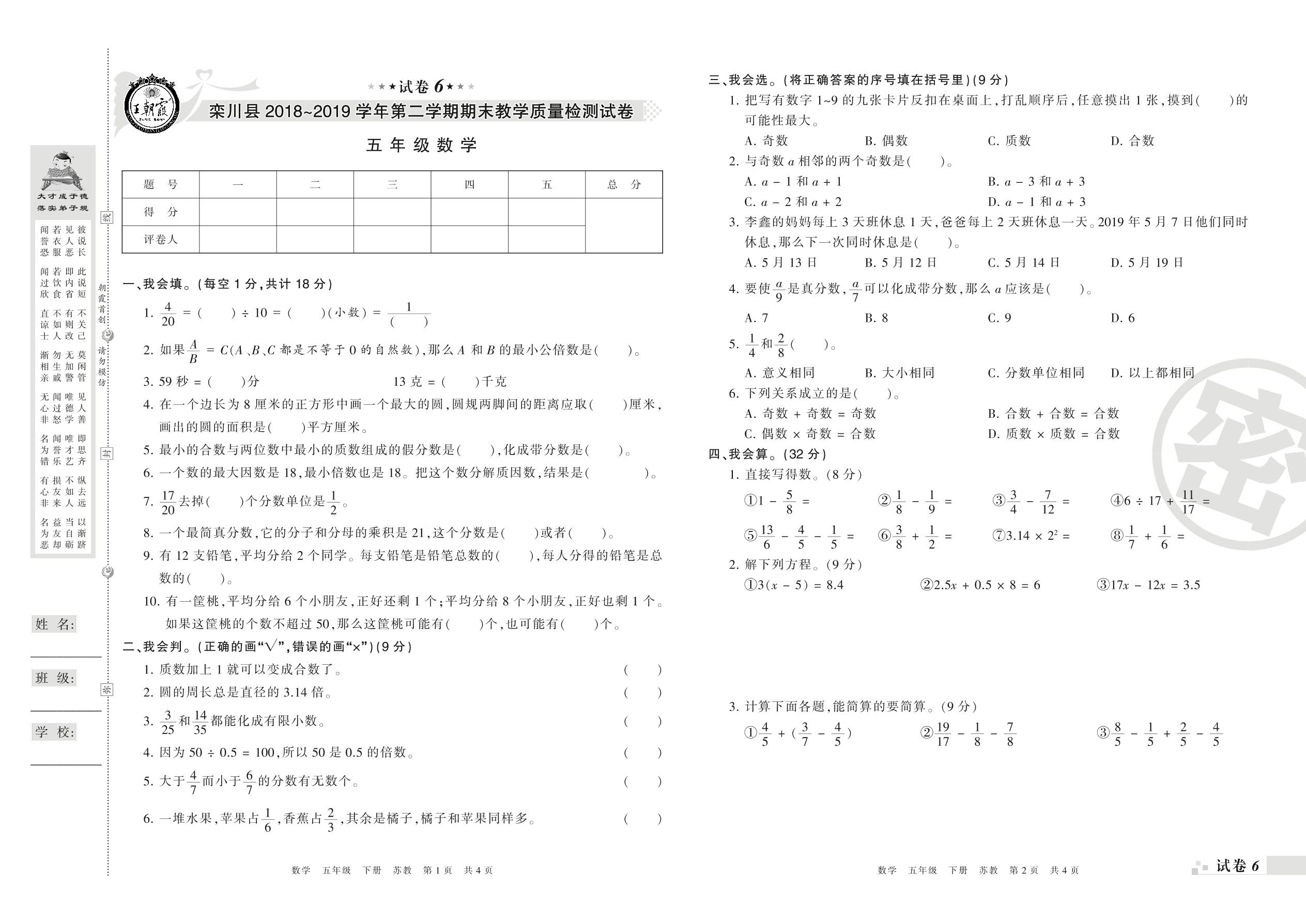 2018-2019学年第二学期洛阳市栾川县五年级数学试卷(苏教版)【6】