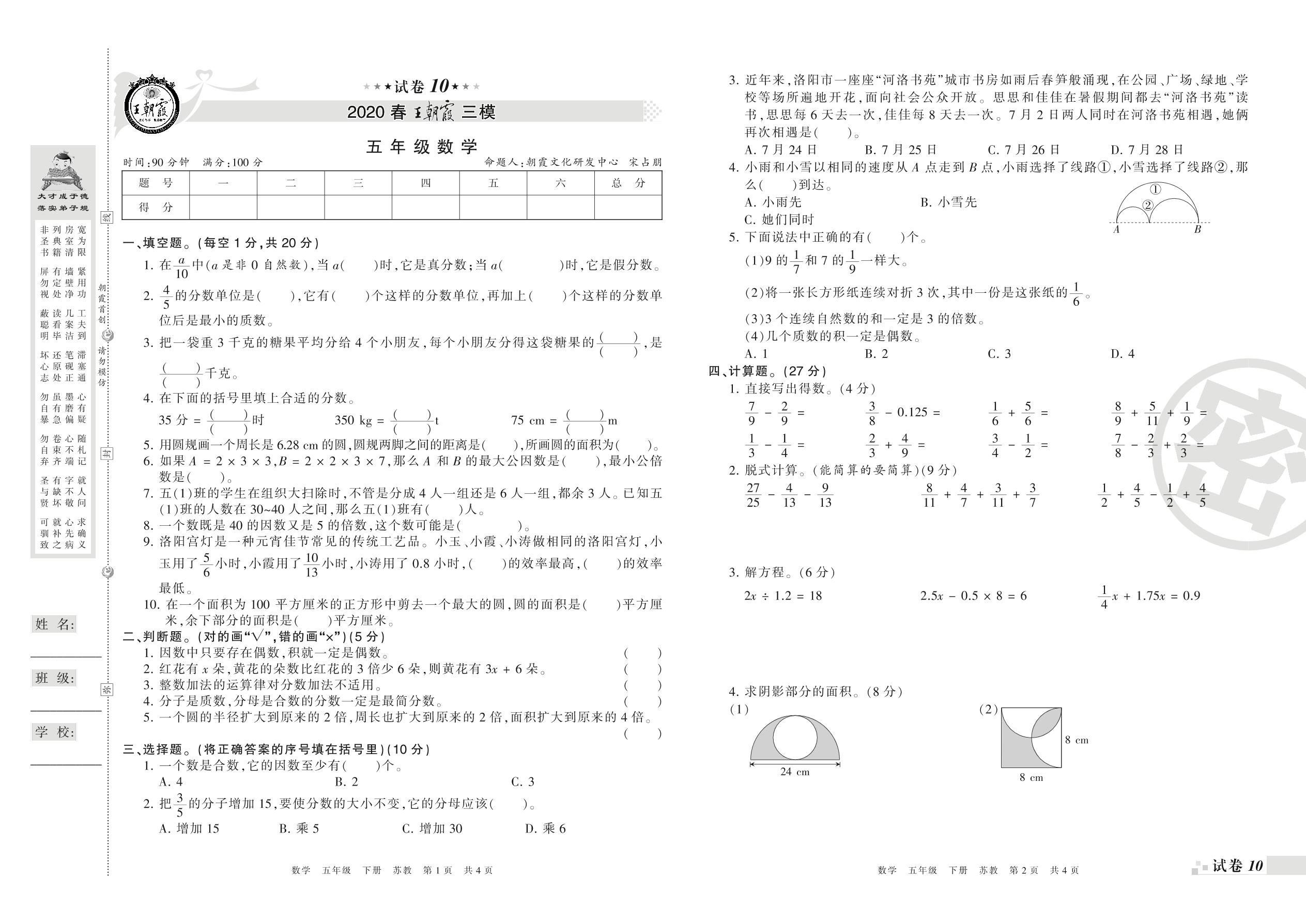 王朝霞期末模拟卷五年级下册数学(苏教版)_R21080585200【10】