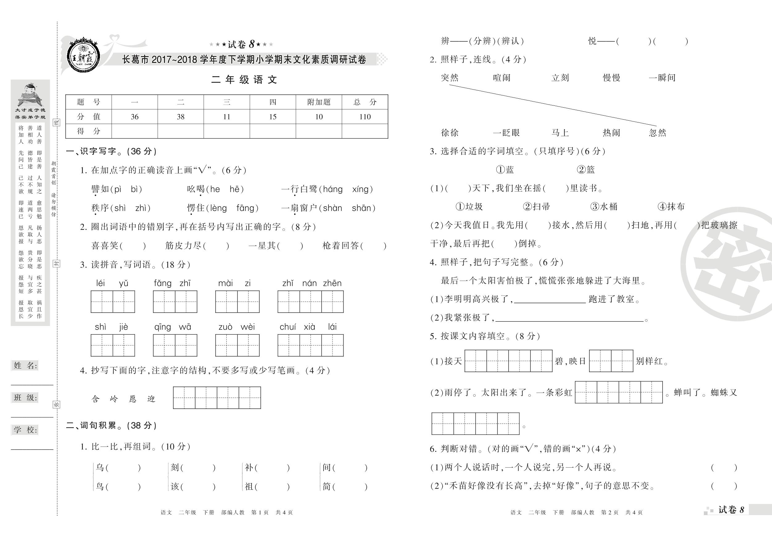2017-2018学年第二学期长葛市二年级语文试卷(人教版)【8】