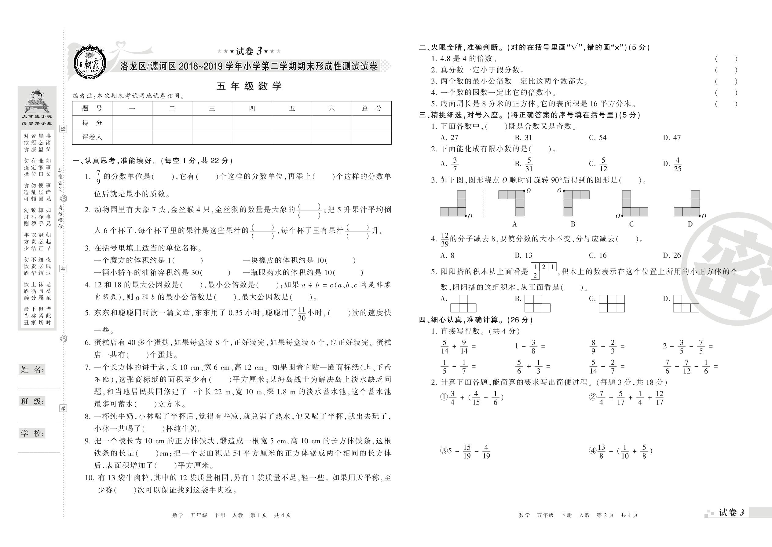 2018-2019学年第二学期洛阳市洛龙区、瀍河区五年级数学试卷(人教版)【3】