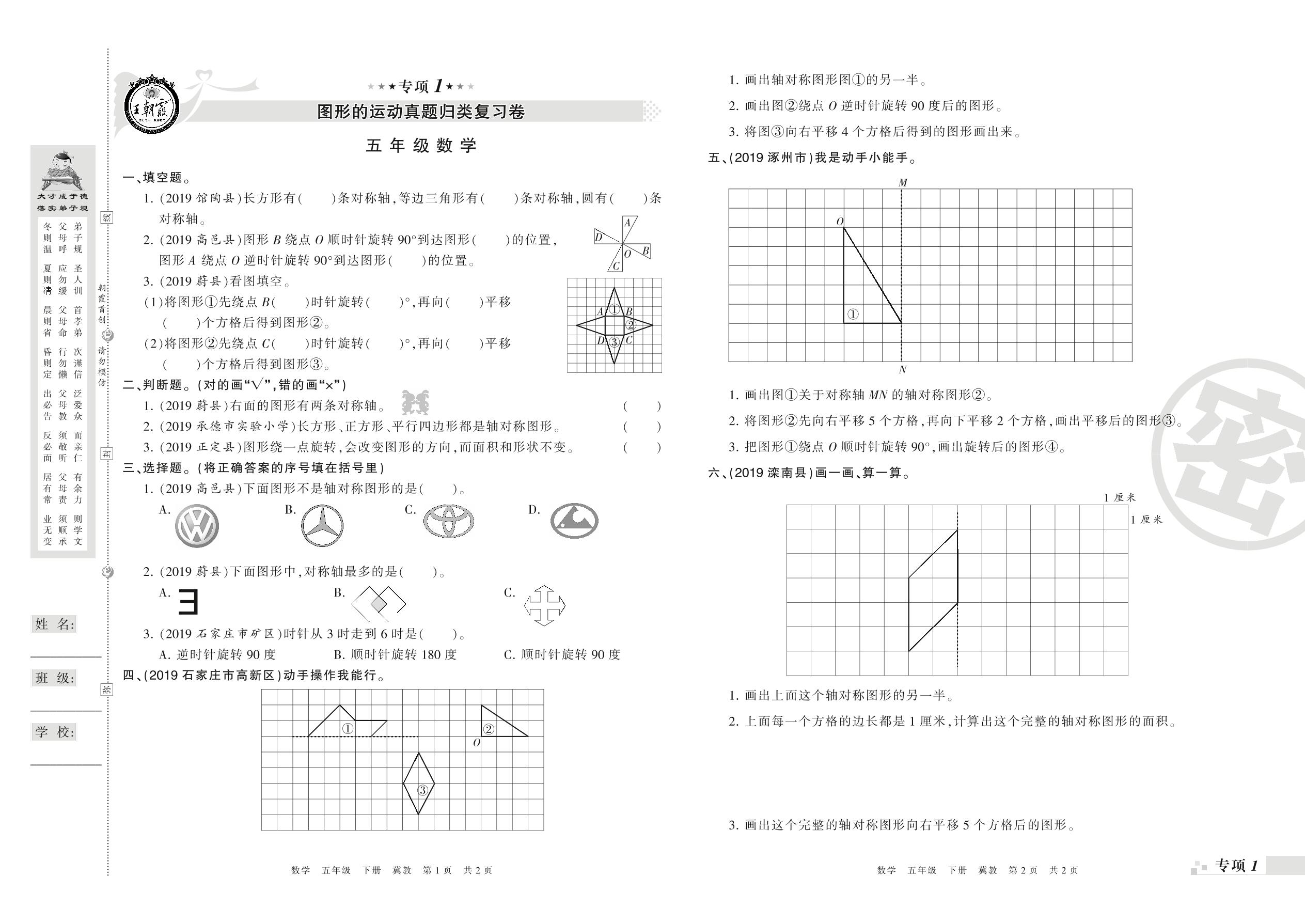 王朝霞期末专项卷——图形的运动、异分母分数加减法真题归类复习卷五年级下册数学(冀教版)_R21080585456【0】