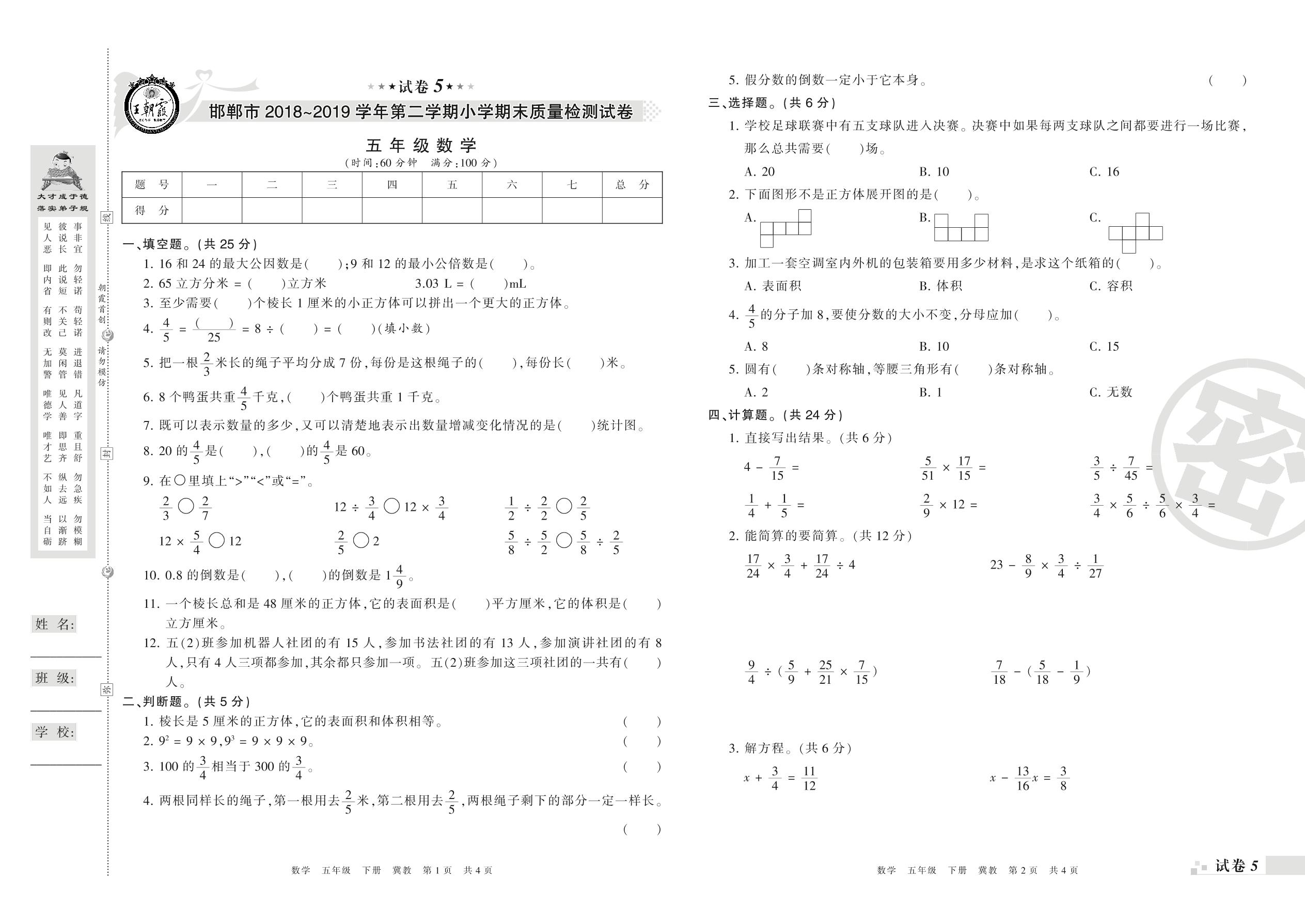 2018-2019学年第二学期邯郸市五年级数学试卷(冀教版)【5】