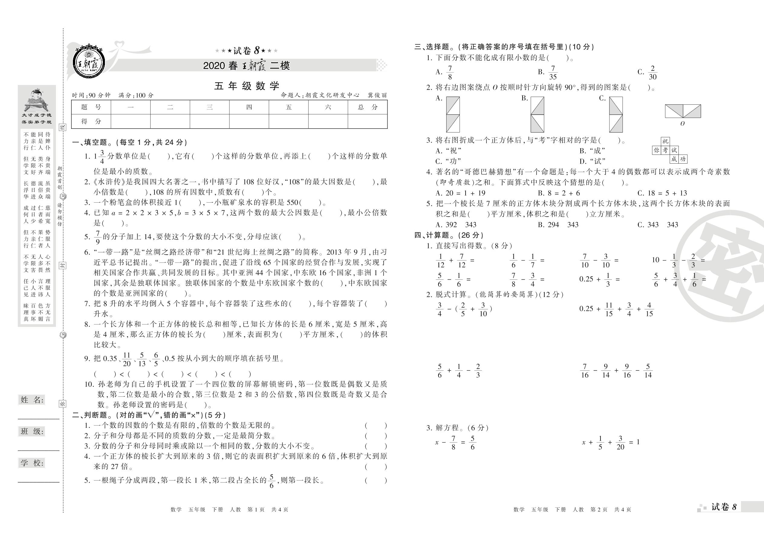 王朝霞期末模拟卷五年级下册数学(人教版)_R21080585659【8】