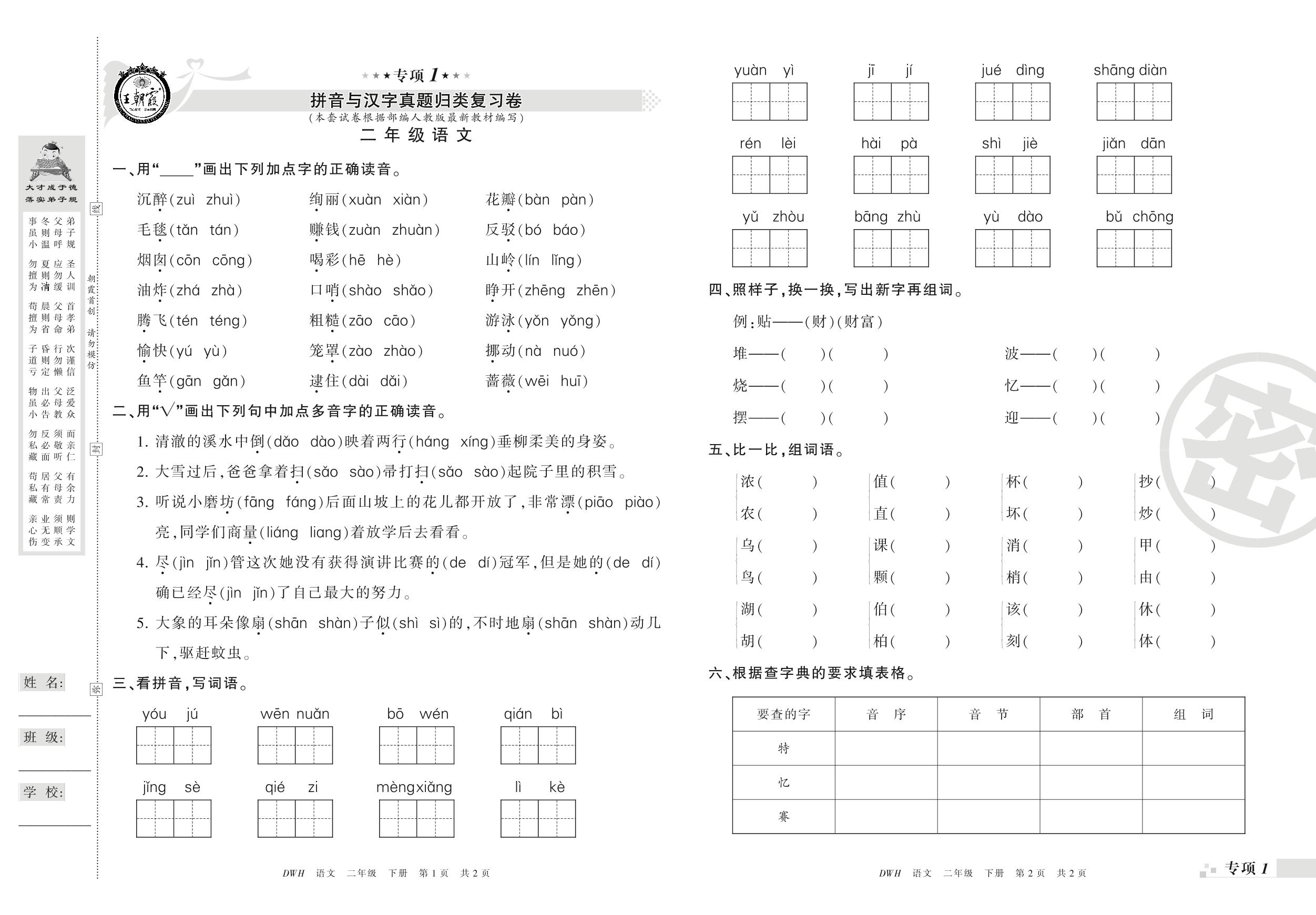 王朝霞期末专项卷——拼音与汉字、词语与句子真题归类复习二年级下册语文(人教版)_R21080172001【0】