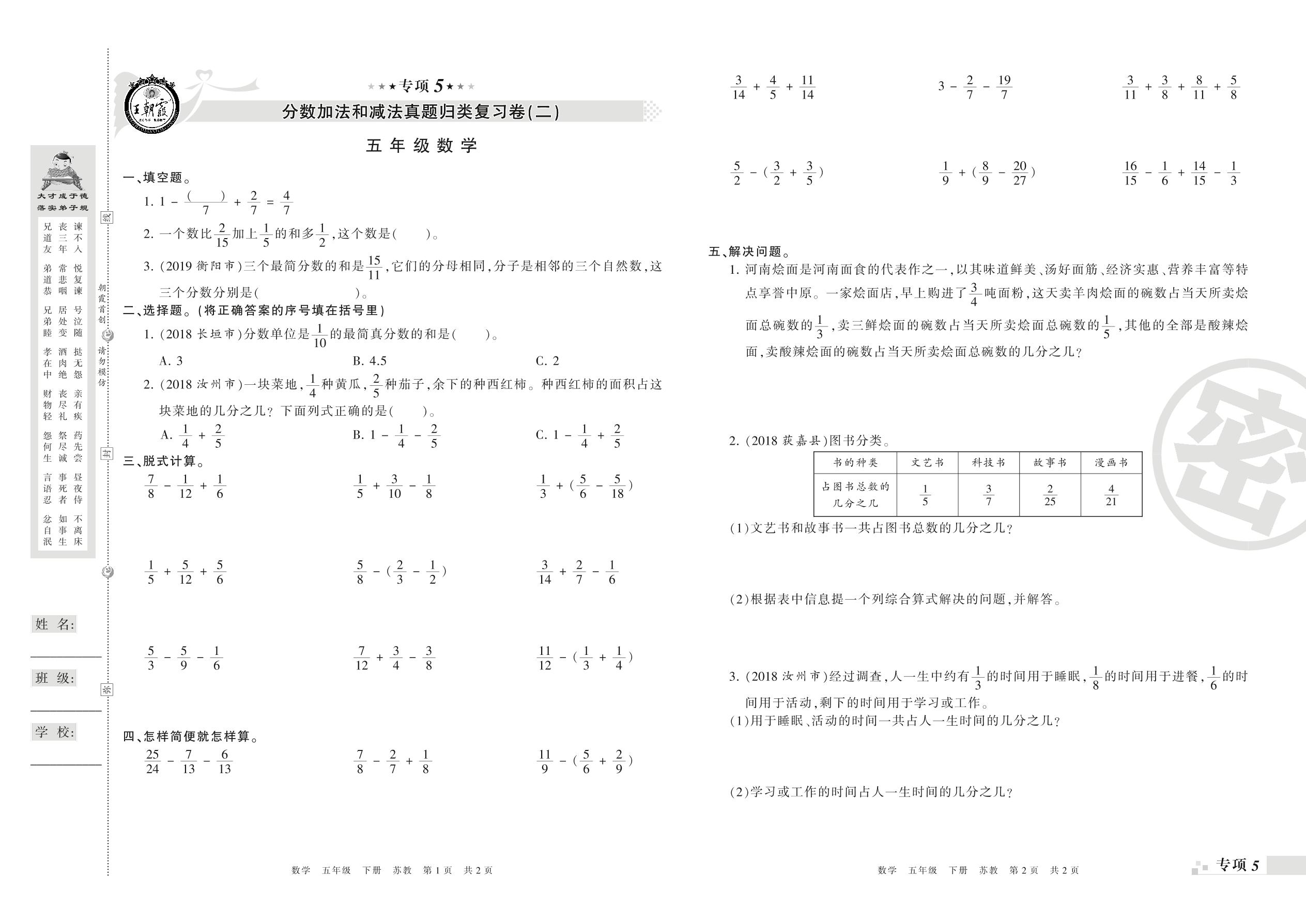 王朝霞期末专项卷——分数加法和减法(二)、圆真题归类复习卷五年级下册数学(苏教版)_R21080585714【0】