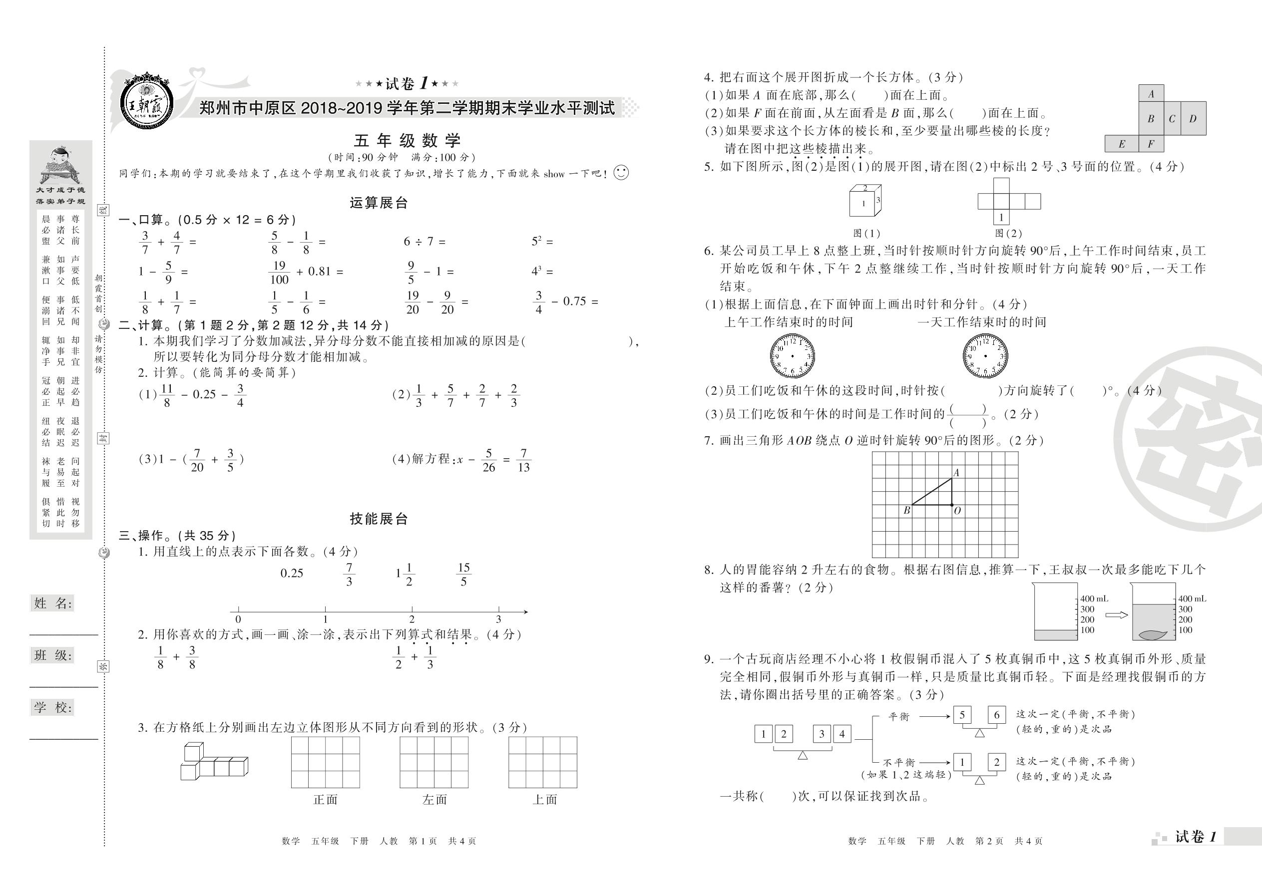 2018-2019学年第二学期郑州市中原区五年级数学试卷(人教版)【1】