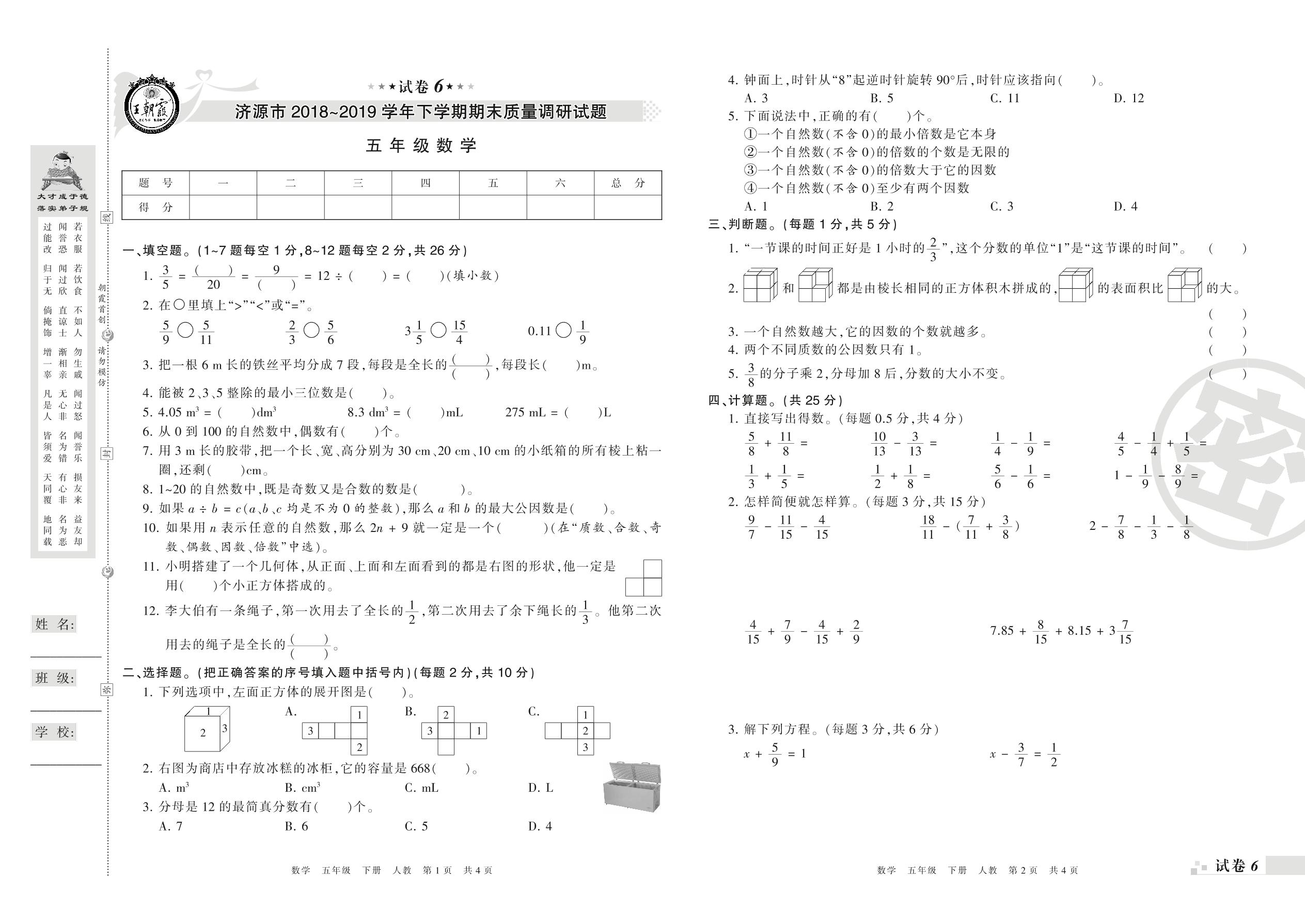 2018-2019学年第二学期济源市五年级数学试卷(人教版)【6】