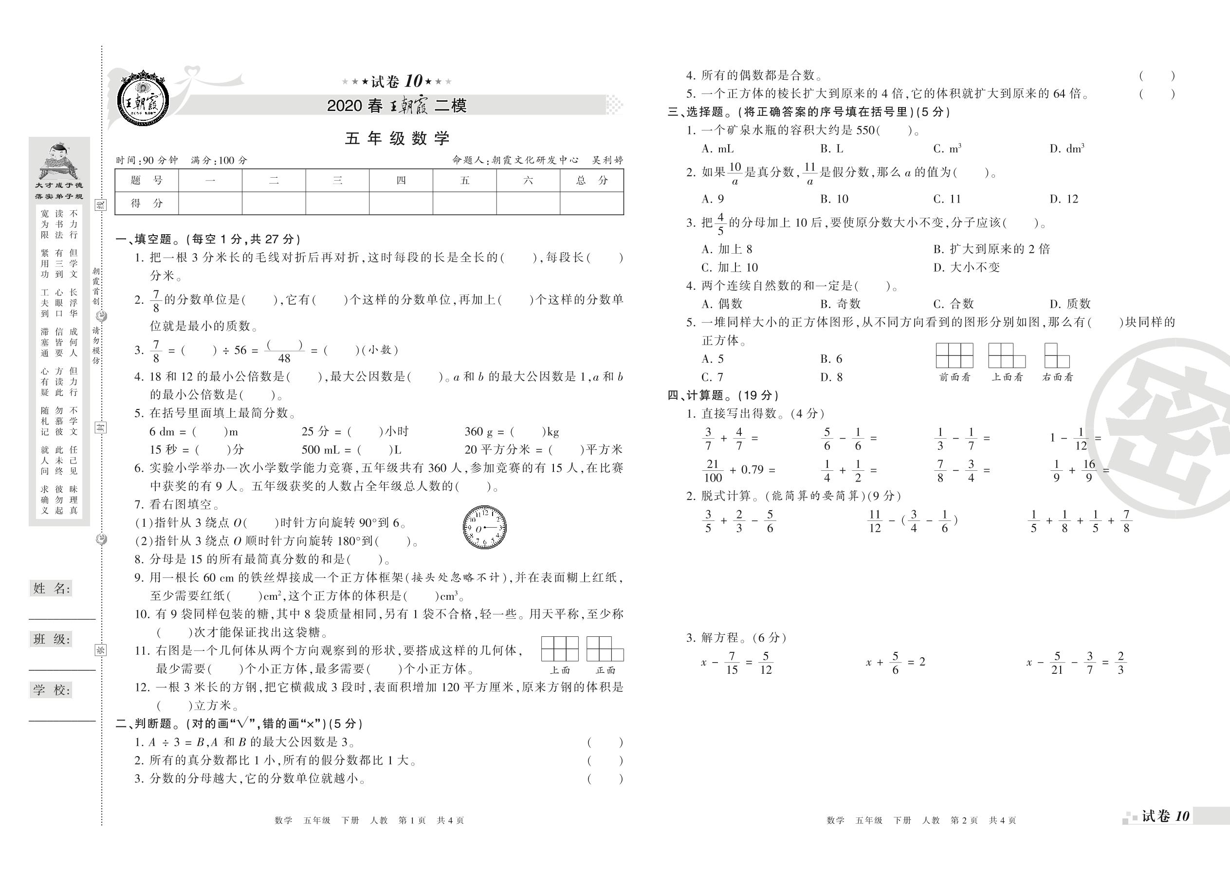 王朝霞期末模拟卷五年级下册数学(人教版)_R21080585903【10】