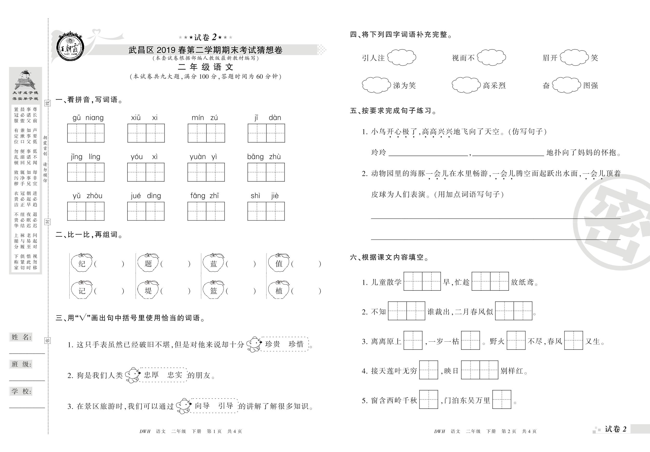 2017-2018学年第二学期武汉市武昌区二年级语文试卷(人教版)【2】