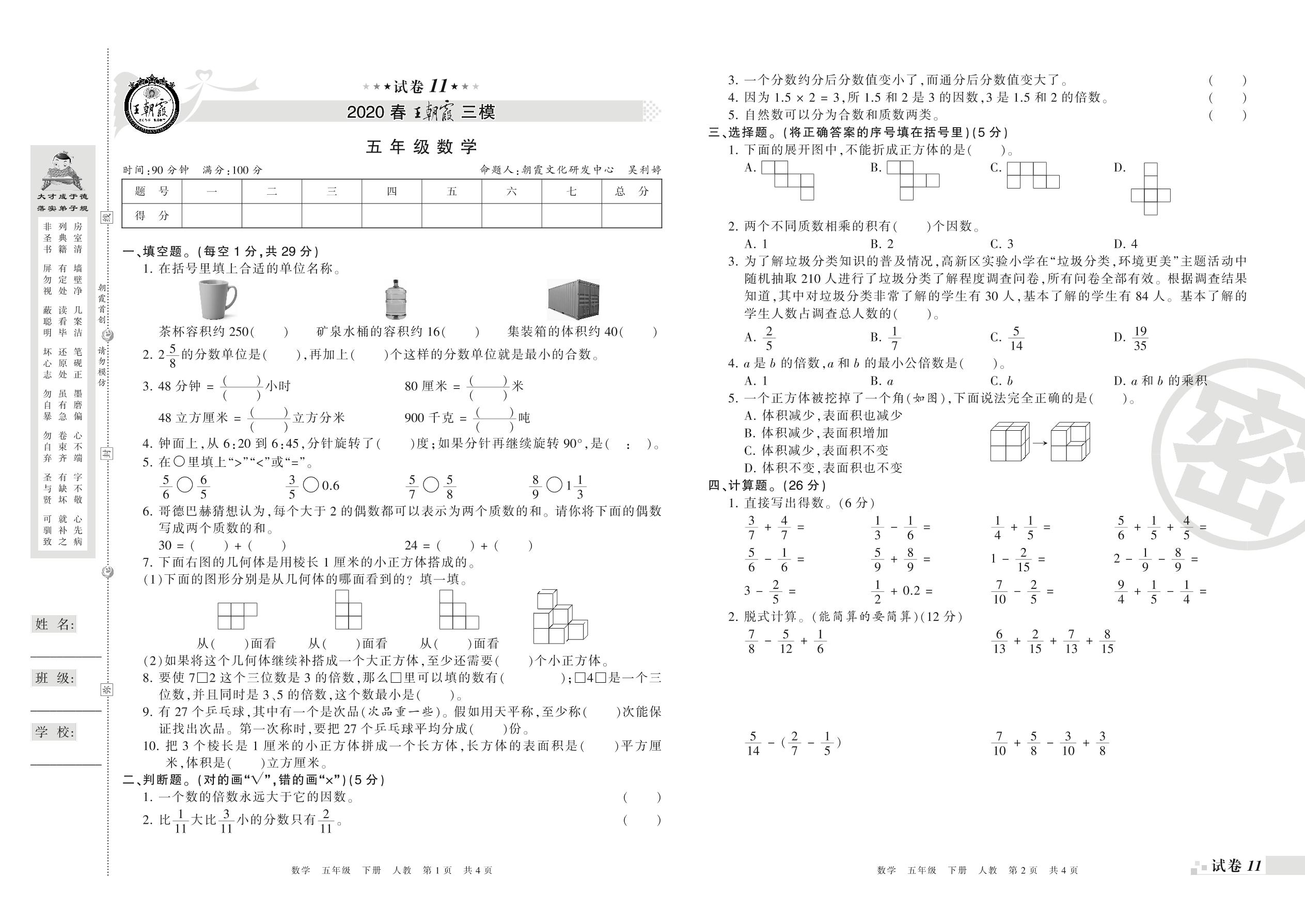 王朝霞期末模拟卷五年级下册数学(人教版)_R21080585907【11】