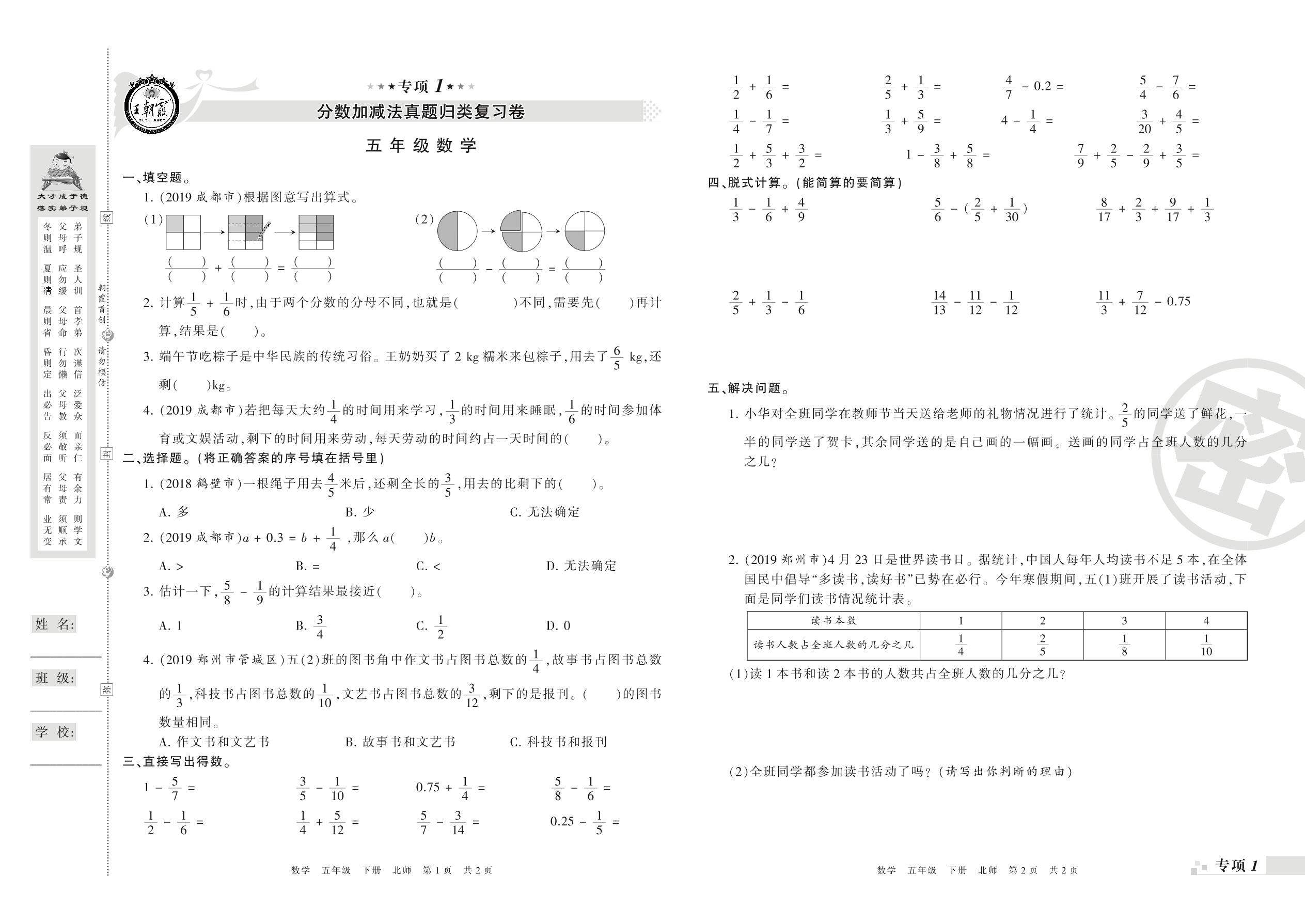 王朝霞期末专项卷——分数加减法、长方体(一)真题归类复习卷五年级下册数学(北师版)_R21080585911【0】