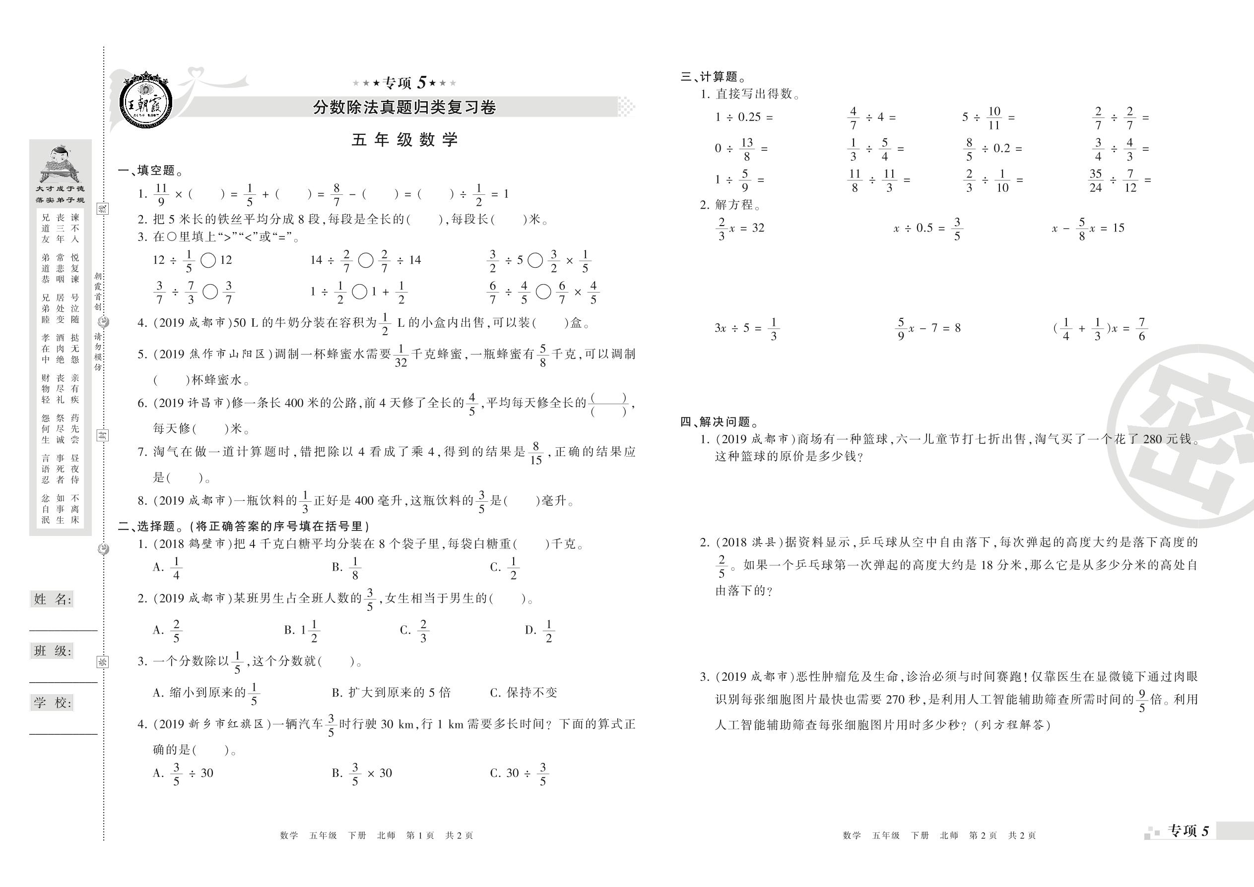 王朝霞期末专项卷——分数除法、用方程解决问题真题归类复习卷五年级下册数学(北师版)_R21080585917【0】