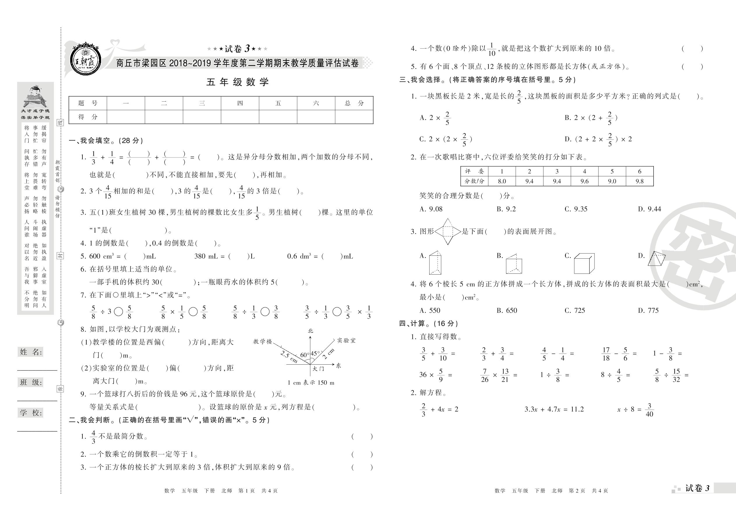 2018-2019学年第二学期商丘市梁园区五年级数学试卷(北师版)【3】