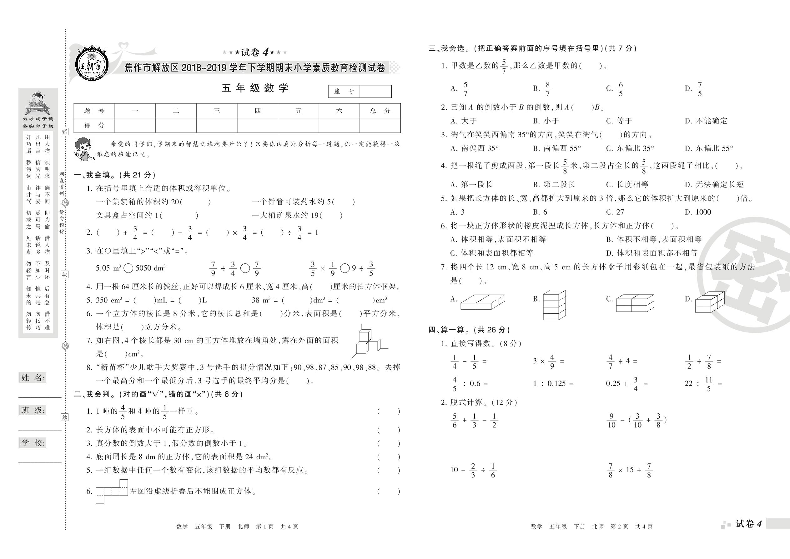 2018-2019学年第二学期焦作市解放区五年级数学试卷(北师版)【4】