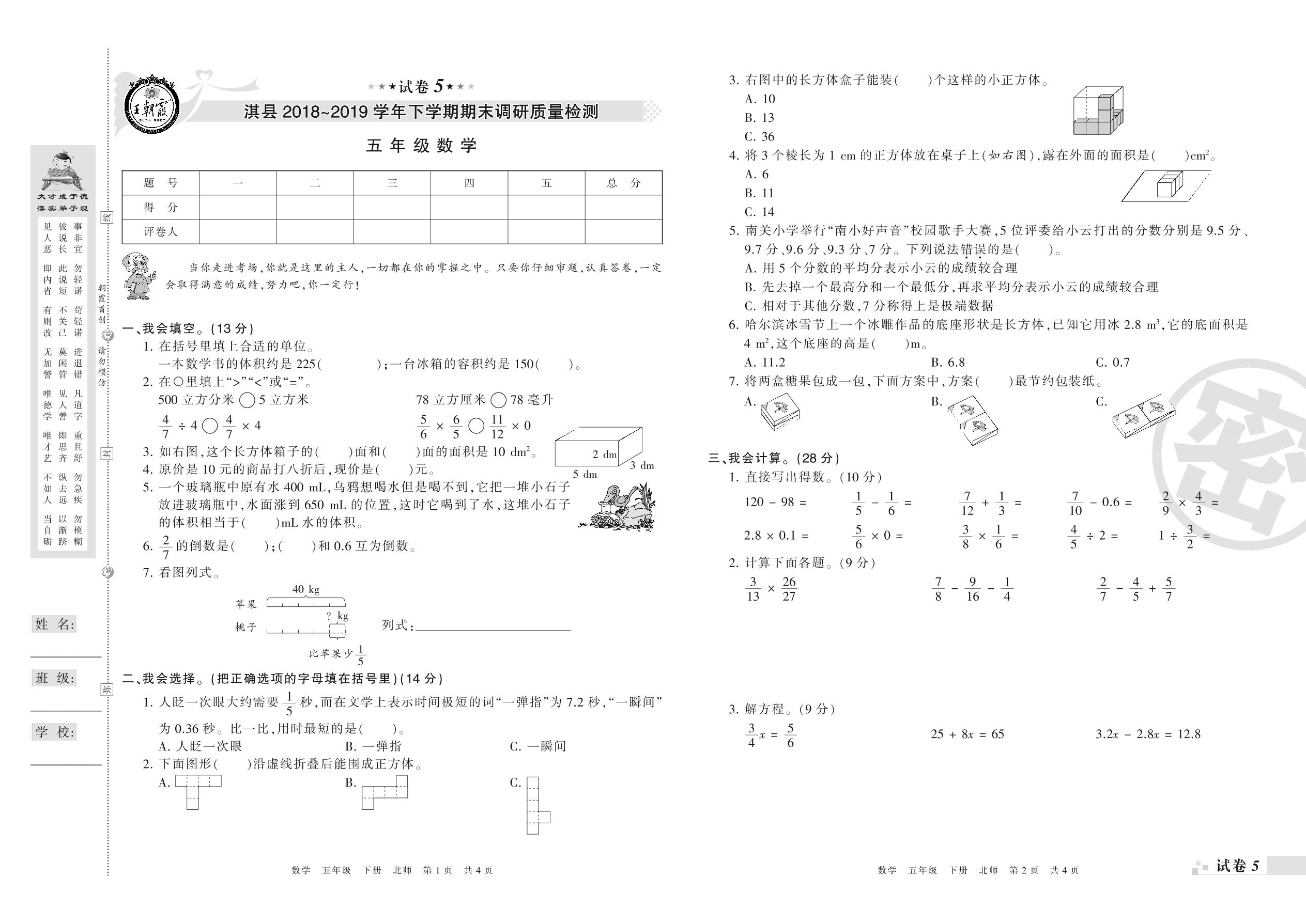 2018-2019学年第二学期鹤壁市淇县五年级数学试卷(北师版)【5】