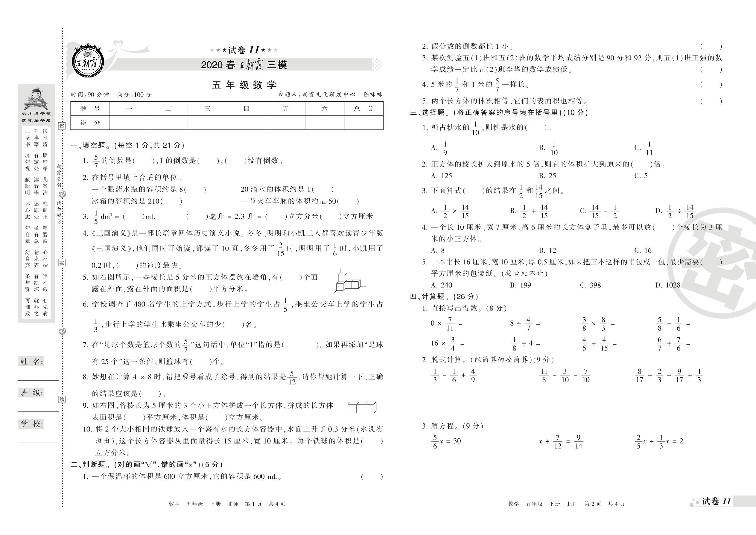 王朝霞期末模拟卷五年级下册数学(北师版)_R21080590003【11】