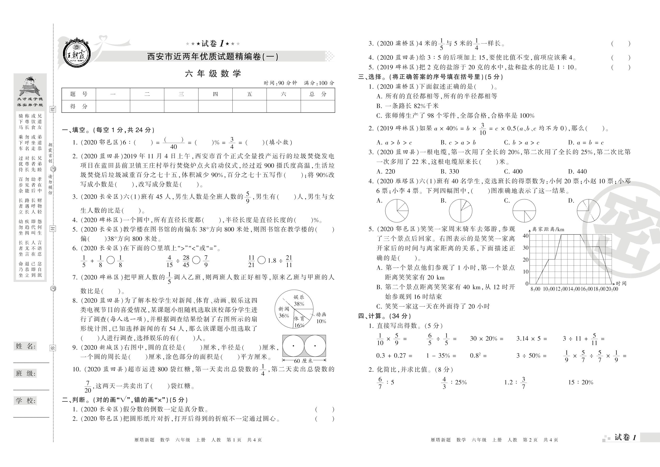 西安市近两年优质试题精编卷(一)六年级上册数学(人教版)【1】