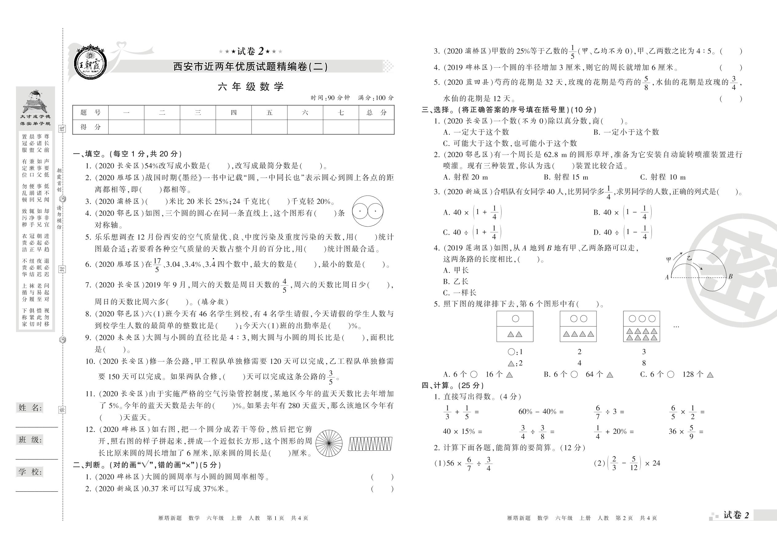 西安市近两年优质试题精编卷(二)六年级上册数学(人教版)【2】