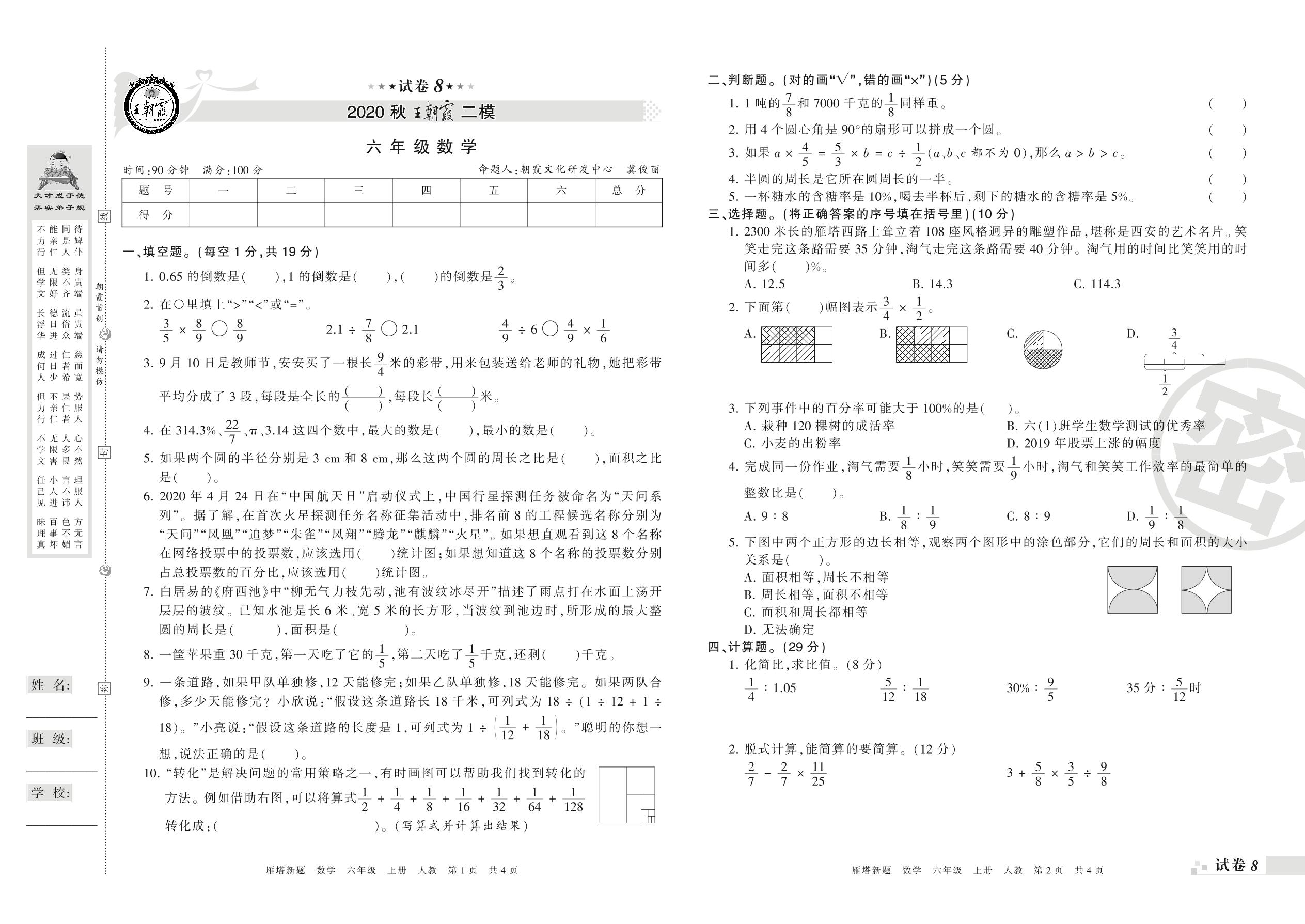 王朝霞期末模拟卷六年级上册数学(人教版)_R21080591124【8】