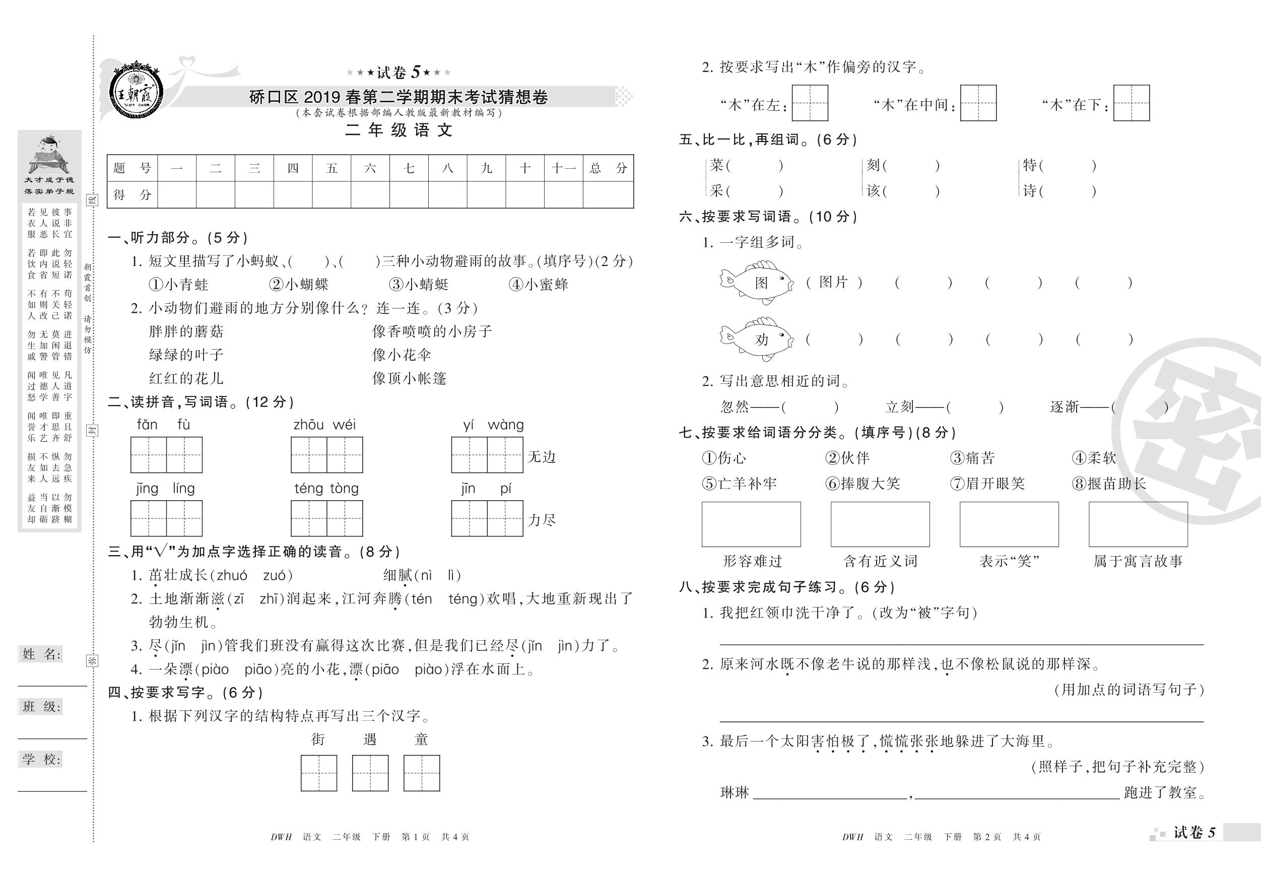 2017-2018学年第二学期武汉市硚口区二年级语文试卷(人教版)【5】