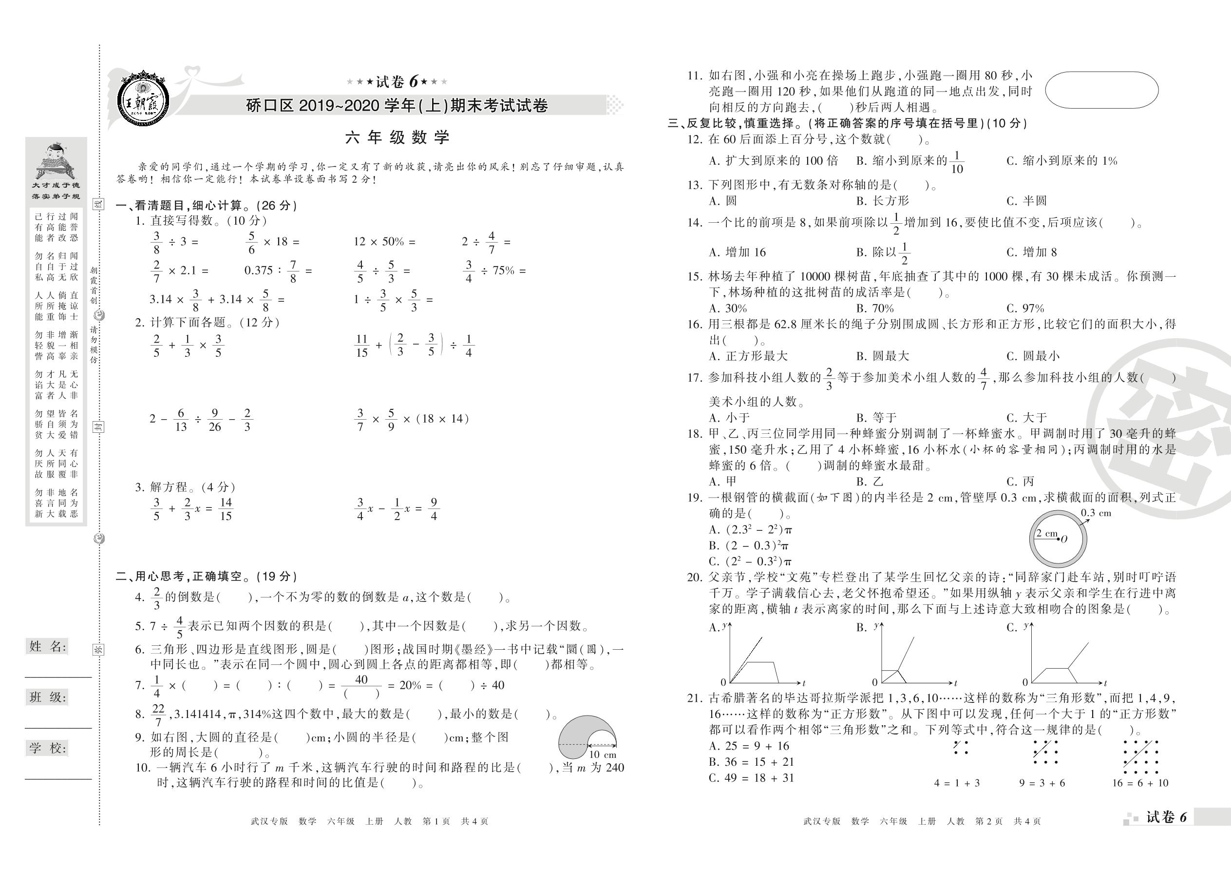2019-2020学年第一学期武汉市硚口区六年级数学试卷(人教版)【6】