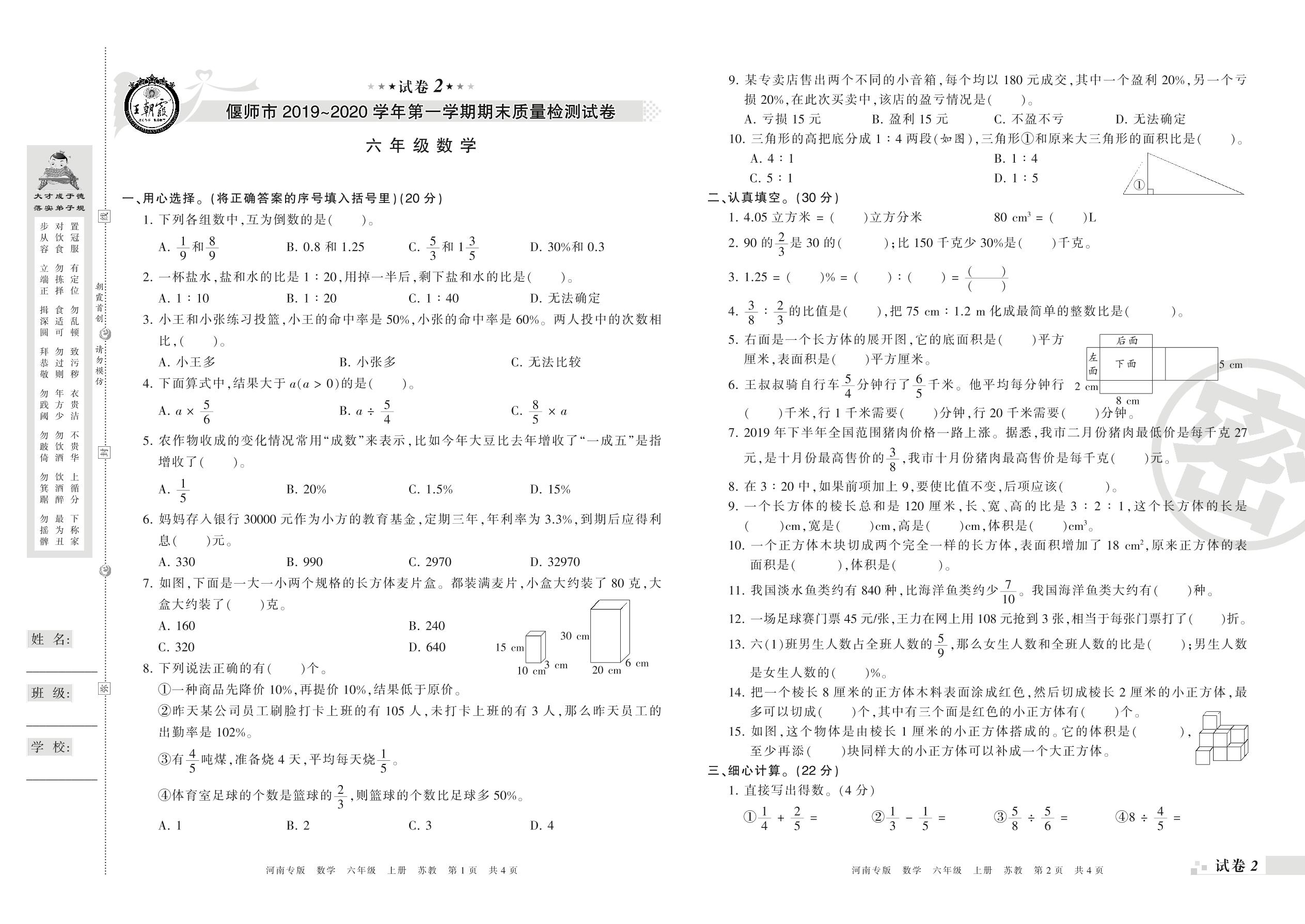 2019-2020学年第一学期偃师市六年级数学试卷(苏教版)【2】