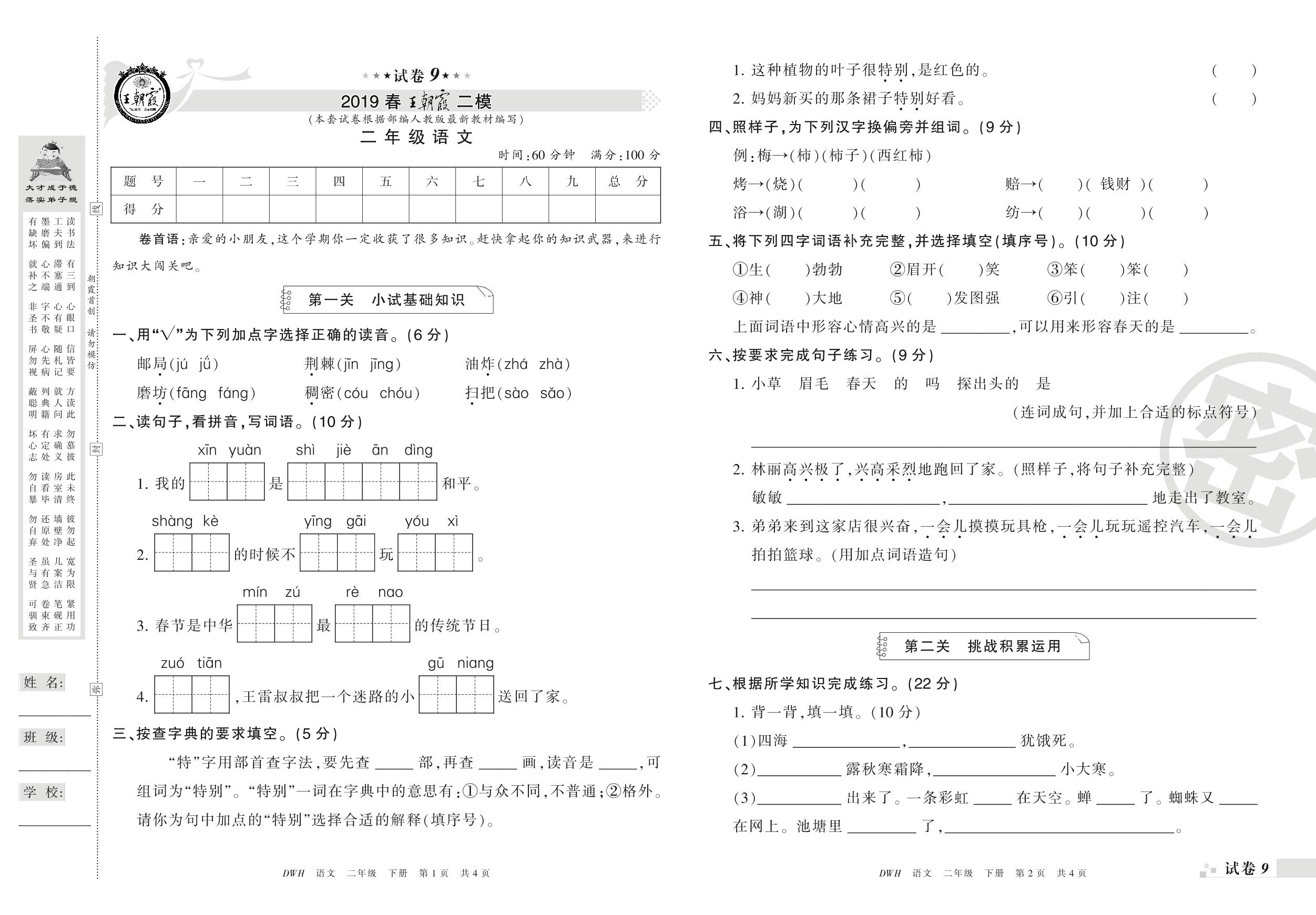 王朝霞期末模拟卷二年级下册语文(人教版)_R21080172031【9】