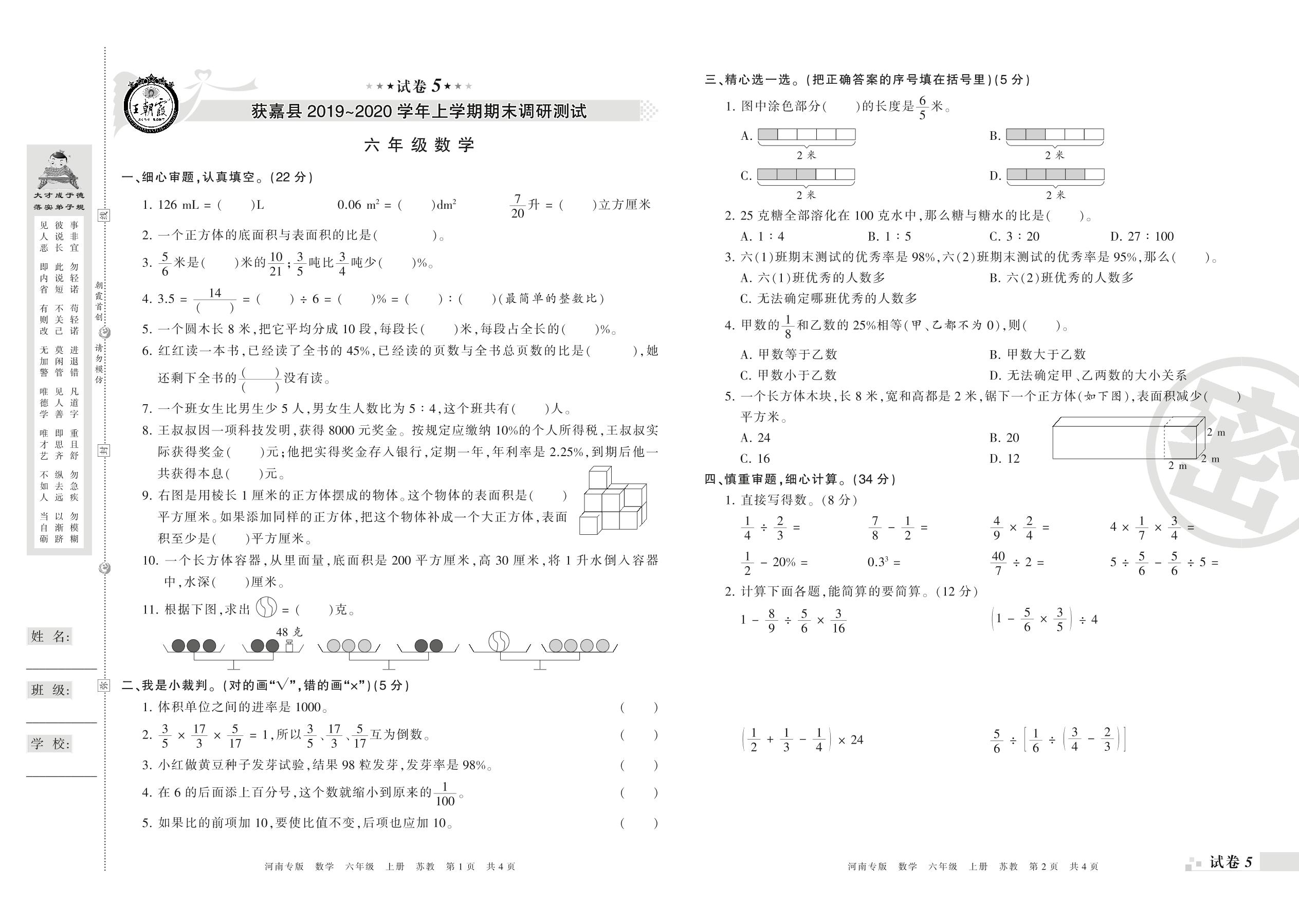 2019-2020学年第一学期新乡市获嘉县六年级数学试卷(苏教版)【5】