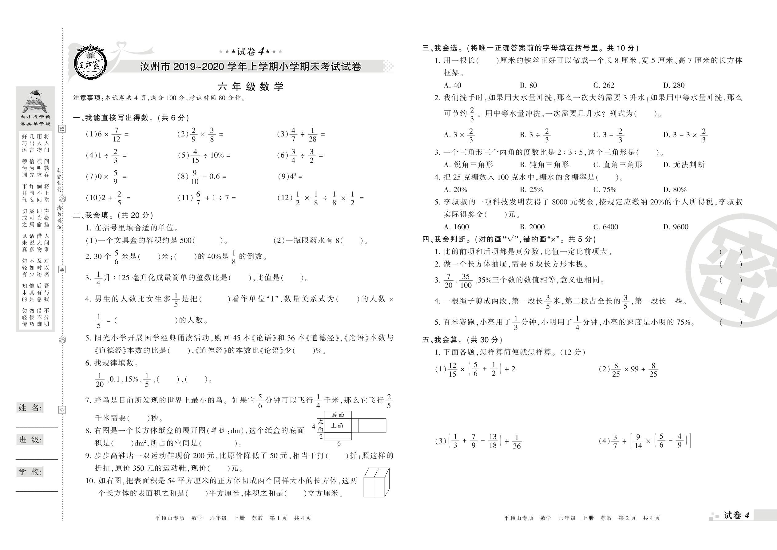 2019-2020学年第一学期汝州市六年级数学试卷(苏教版)【4】