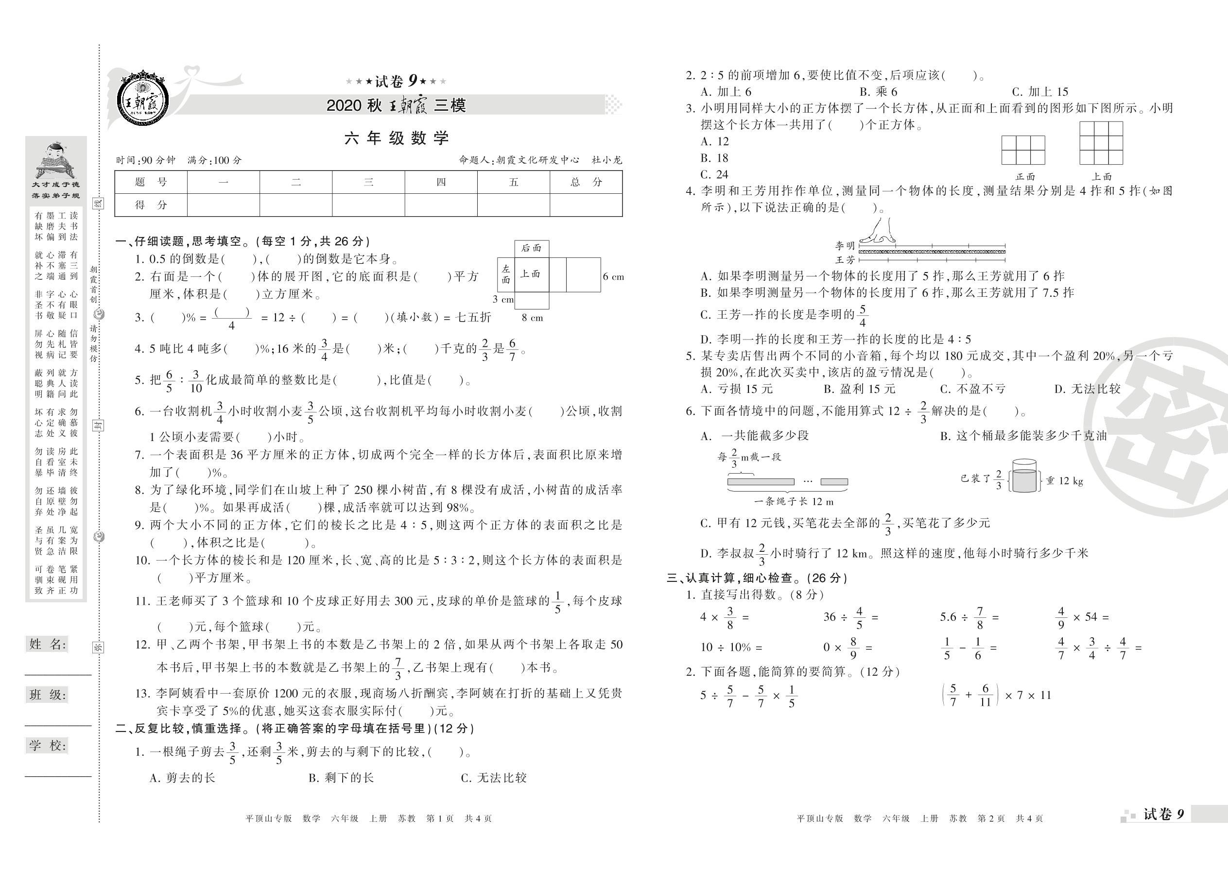 王朝霞期末模拟卷六年级上册数学(苏教版)_R21080591705【9】
