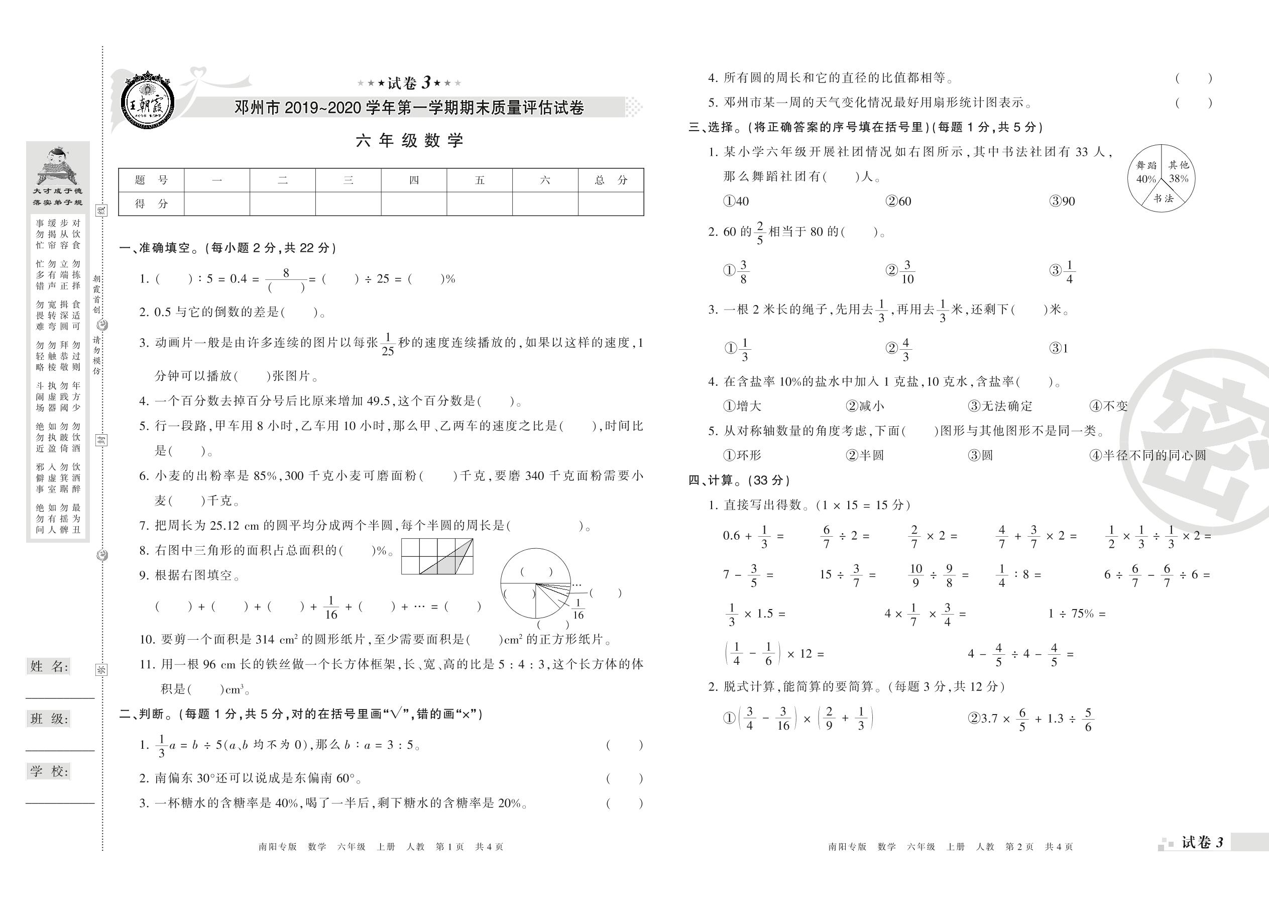 2019-2020学年第一学期邓州市六年级数学试卷(人教版)【3】